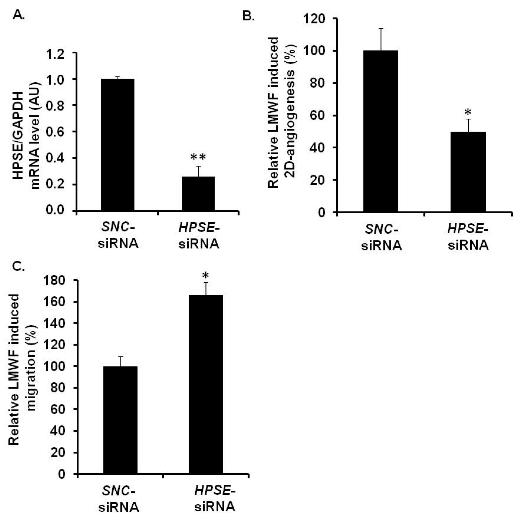 Assessment of HPSE involvement in biological effects of LMWF in HUVECs. HUVECs were transfected with HPSE-siRNA or SNC-siRNA control. (A) HPSE mRNA levels were determined in HPSE-siRNA- or SNC-siRNA-transfected cells by real-time RT-PCR. HPSE mRNA level normalized to GAPDH mRNA level in SNC-siRNA-transfected control cells was arbitrary set to 1; (B) 2D-angiogenesis was assayed in cells treated with or without 10 µg/mL LMWF. The difference in the capillary network length between LMWF-treated and untreated cells in HPSE RNA interference condition was compared to that in SNC-siRNA-transfected cells; (C) Migration was assayed in cells treated with or without 10 µg/mL LMWF. Control LMWF induction was arbitrary set at 100% for SNC-siRNA-transfected cells. * p < 0.05, ** p < 0.005 versus SNC-siRNA-transfected control cells. A.U.: arbitrary unit.