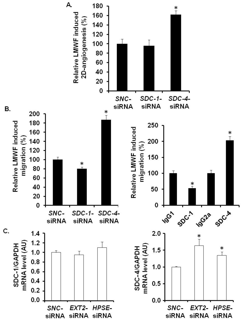 Assessment of SDC involvement in biological effects of LMWF in HUVECs. 2D-angiogenesis (A) and migration (B) assays were performed in SDC-1-siRNA- or SDC-4-siRNA- or SNC-siRNA-transfected control cells (B, left panel), or in cells treated with specific anti-SDC-1 or anti-SDC-4 antibodies (B, right panel). Control LMWF induction was arbitrary set at 100% for SNC-siRNA-transfected cells or isotypes. (C) SDC-1 and SDC-4 mRNA expression was analyzed in EXT2- or HPSE-siRNA-transfected cells. * p < 0.05 versus SNC-siRNA-transfected control cells or isotypes. A.U.: arbitrary unit.
