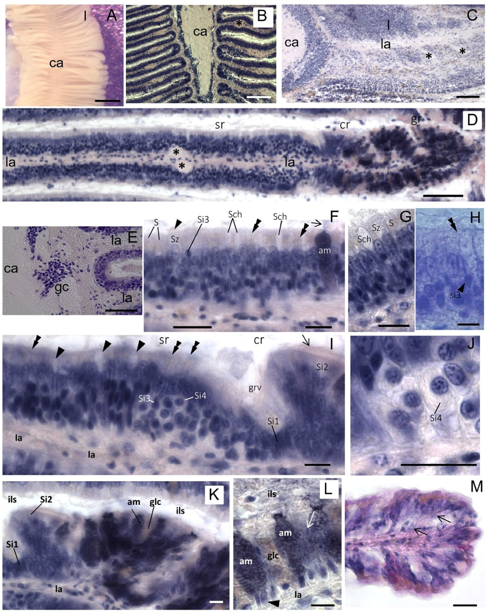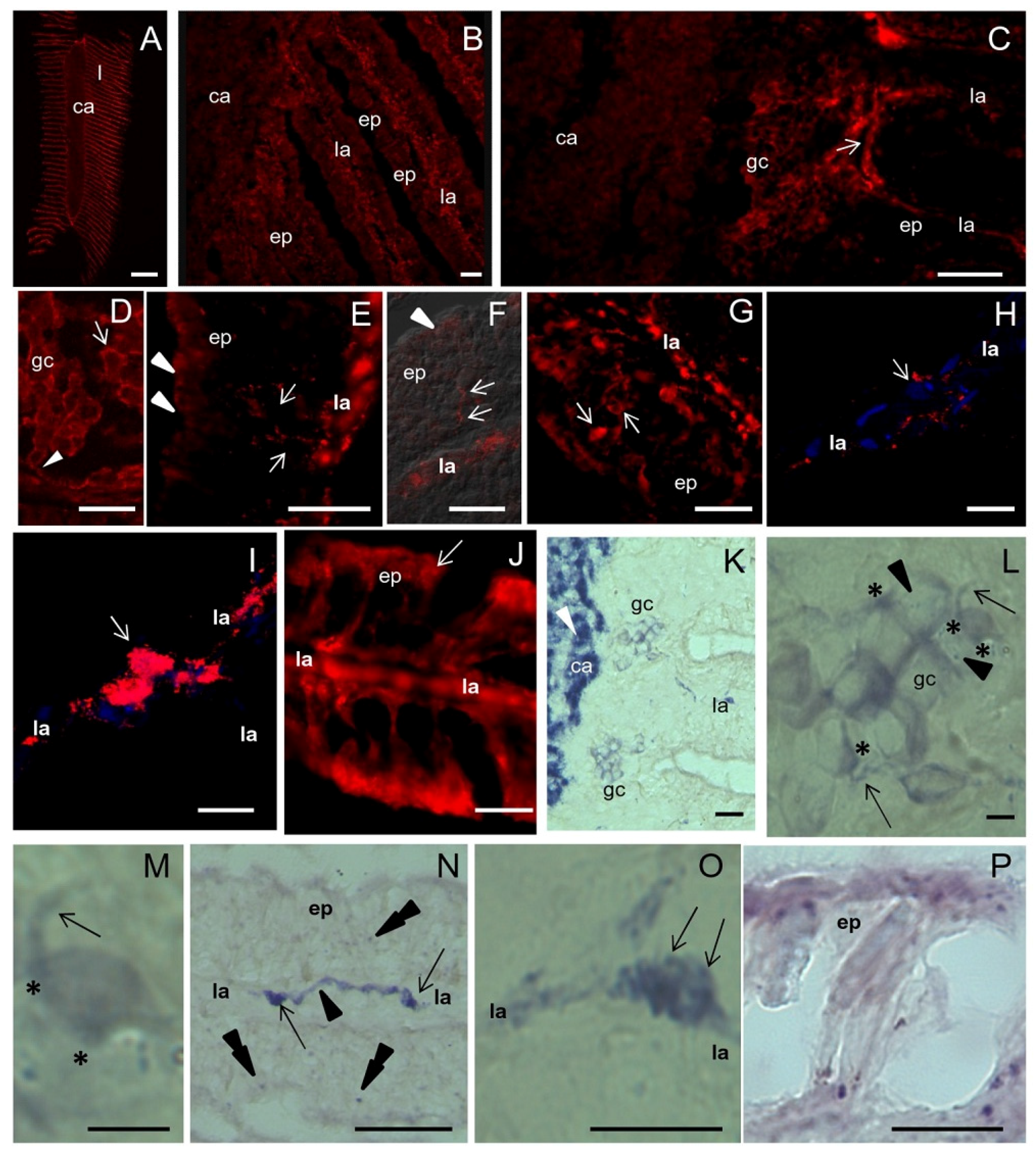 Before proceeding with the IF analysis, histological observations were performed on serial sections of foot, osphradium and tentacle stained by hematoxylin-eosin to have basic information on their histological structure in S. haemastoma.
