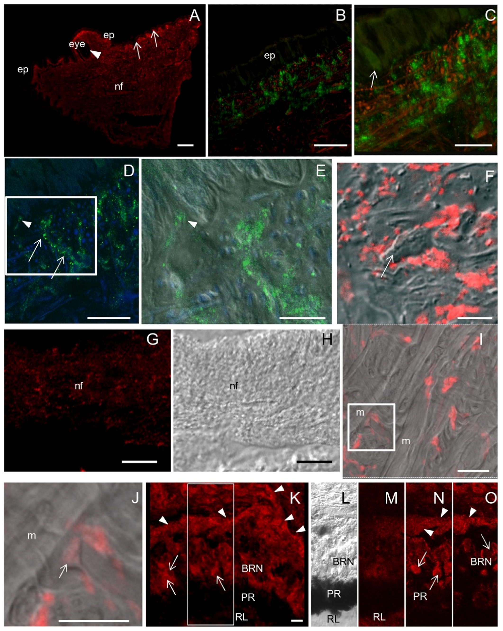 Foot: histology, NOS distribution and NADPHd staining. A–E: Histological analysis. F–N: NOS distribution analyzed by R20 antibody. O: NADPHd staining. (A,B) Sagittal section of the foot stained with hematoxylin/eosin. The ciliated columnar epithelium contains two types of gland cells with a different affinity for hematoxylin (arrows and arrowheads). Asterisks indicate pigment granules. The wavy basal lamina (double arrowhead) separates the epithelium from the underlying tissues; (C) Picture showing gland cells pouring their secretion on the foot surface. Slender cell processes are seen between epithelial elements (arrowhead); (D) The superimposition of TOTO3 staining to DIC allows a better appreciation of the cell morphology. Gland (arrows) and epithelial (asterisk) cells are visible. Beneath the epithelium, bipolar neurons are clearly seen (arrowhead); (E) DIC image at high magnification showing the presence of thin cell processes among epithelial elements (arrow). Cell processes contact the epithelial surface (arrowhead); (F) Sagittal section showing the distribution of NOS-like proteins beneath the epithelium; (G) Enlargement of the small boxed area in F. NOS-IR cells (arrow) and fibers (arrowheads) are seen; (H) Detail of the large dot-boxed area in F. NOS staining is intense at the base of the epithelium where NOS-IR cells and fibers are in close contact with epithelial cells (arrows). The epithelium exhibits a much weaker staining that is more intense in the apical portion; (I) IF image showing NOS-IR neurons (arrows) with processes penetrating the epithelium (arrowheads); (J) Detail showing intensely labeled NOS-IR cells in the subepithelial layers (arrows). Aligned NOS-positive spots toward the surface are visible (arrowheads) among epithelial cells, suggesting the presence of NOS-IR varicose fibers; (K,L) CM images of the same section confirming the wide distribution of NOS-like proteins beneath the epithelium. NOS-IR cells (arrows) and fibers are present. In the epithelium, a diffuse NOS labeling was observed in gland (arrowheads) and epithelial cells. The apical portion of epithelial cells shows an intense NOS-immunoreactivity. In L triple labeling with NOS antibodies (green), phalloidin (red) and TOTO3 (blue) is shown to better evaluate the distribution of NOS-positive staining; (M) Detail of the epithelium where the presence of NOS-IR thin processes (arrowheads) directed to the epithelium surface can be glimpsed among epithelial cells; (N,O) The same sagittal section of the foot stained with NOS-antibodies (N) and NADPHd assays (O). The two stainings overlapped in both cells (arrow) and cell processes (arrowheads). The number of NOS-positive elements was higher in IF than in NADPHd images. The detection of NADPHd reactivity in the epithelium was difficult due to the presence of natural pigments that obscure NADPHd staining. Bars: A, C–E, G–O = 25 μm; B, M = 10 μm; F = 50 μm.