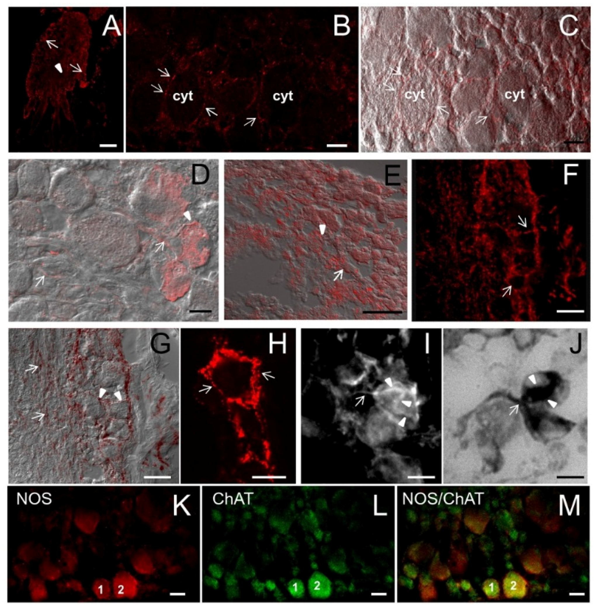 NOS distribution in the pedal ganglion. (A) Low magnification showing the gross distribution of NOS staining in the pedal ganglion. Both round neuron cell bodies (arrows) and nerve fibers (arrowhead) are labeled by NOS antibodies. (B) In this CM microphotography, the weak NOS staining in the cytoplasm (cyt) can be compared to the intense spotted staining on the neuronal surface (arrows); (C) Superimposition of NOS staining in B to the DIC image showing the position of NOS-positive spots in relation to cell morphology; (D,E) NOS/DIC image showing NOS-IR axons (arrows). NOS labeling appears particularly intense in the region where axons contact the neuron cell soma (arrowheads); (F) CM image showing the intense NOS staining around unstained neuron cell bodies (arrows); (G) Superimposition of NOS staining to DIC image allows us to better appreciate the intense NOS staining at the periphery of neuron cell bodies (arrowheads) and NOS-IR nerve fibers (arrows); (H) Detail of NOS staining in a single neuron: intense and defined NOS-labeled spots are present at the periphery of the cell (arrows); (I) IF microphotography showing NOS-positive neuronal processes (arrow) contacting one NOS-IR neuron. Note that NOS staining is diffuse and weak in the cell cytoplasm. NOS-stained neuronal processes have a basket-like distribution on the neuron cell soma (arrowheads). (J) NADPHd staining of the consecutive section to that in I containing the same neurons. A good overlapping of NOS and NADPHd staining can be observed; (K–L) Double-CM immunostainings of the pedal ganglion for NOS (K) and ChAT (L); (M) Overlay of fluorescence signals shown in K and L show that NOS and ChAT are co-localized in several neurons; the numbers “1” and “2” refer to the same neurons. A–E, K: M_R20 antibody; F–H: H299 antibody. A= 200 μm; B–D, F, G, K–M = 25 μm; E, H–J = 10 μm.