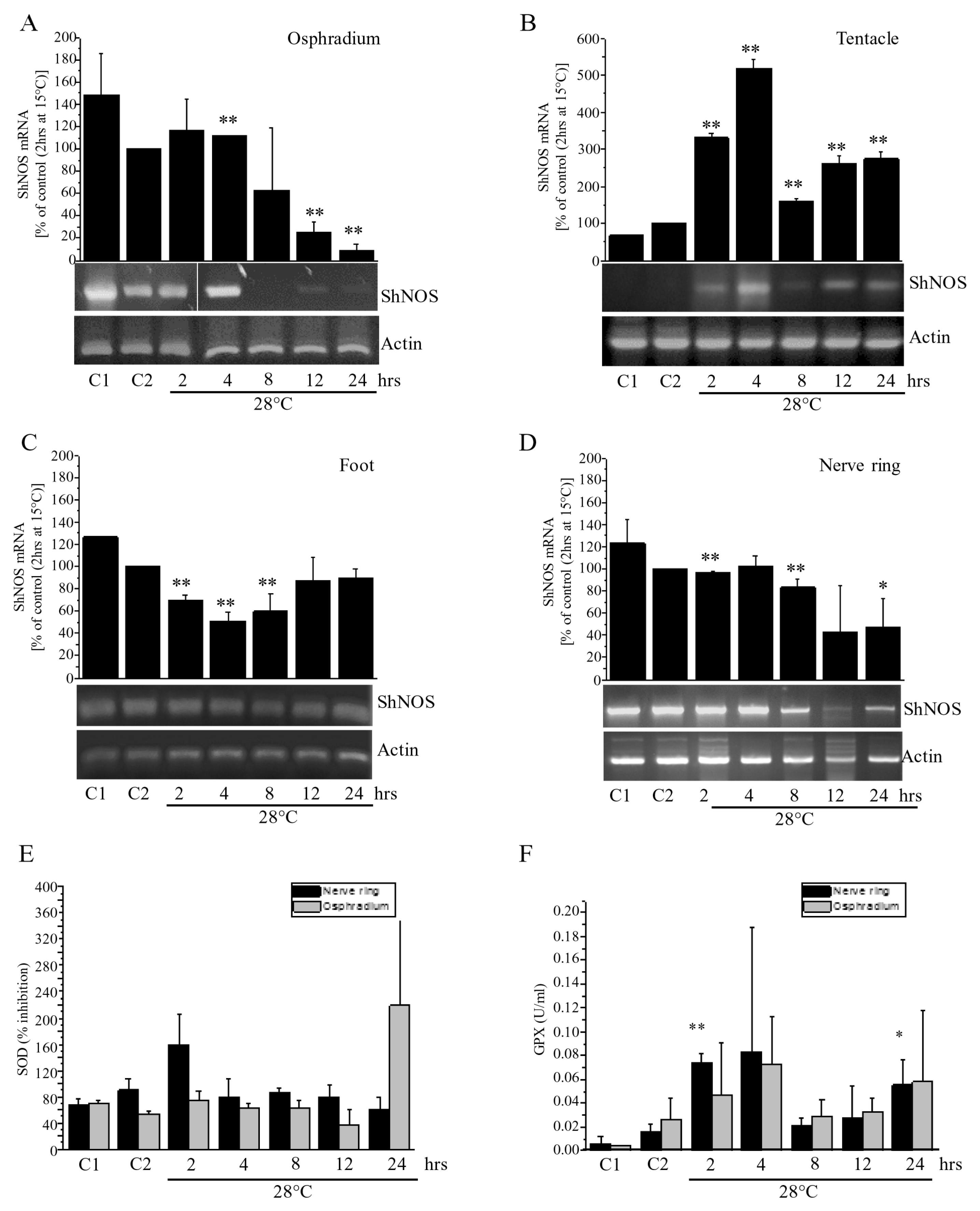 Effect of thermal stress on NOS gene expression and SOD and GPX activity in S. haemastoma organs. A–D: Semi-quantitative RT-PCR analysis of NOS gene expression normalized on actin performed in the osphradium (A), tentacle (B), foot (C) and nerve ring (D) samples of specimens placed at 28 °C for 2–24 h. C1 refers to control samples acclimated for 40 days at 15 °C and C2 refers to control samples transferred from the “home tank” at 15 °C to the “experimental tank” at the same temperature of 15 °C for 2 h. Band quantification was performed by Image J software; (E,F) SOD activity expressed as percentage of inhibition and GPX activity expressed as U/mL evaluated in the nerve ring (black bars) and osphradium (grey bars) subjected to thermal stress. The graph shows the average ± s.d. of three different experiments, performed under identical conditions. Asterisks indicate statistically significant difference (* = p < 0.05; ** = p < 0.02) between each sample and C2.