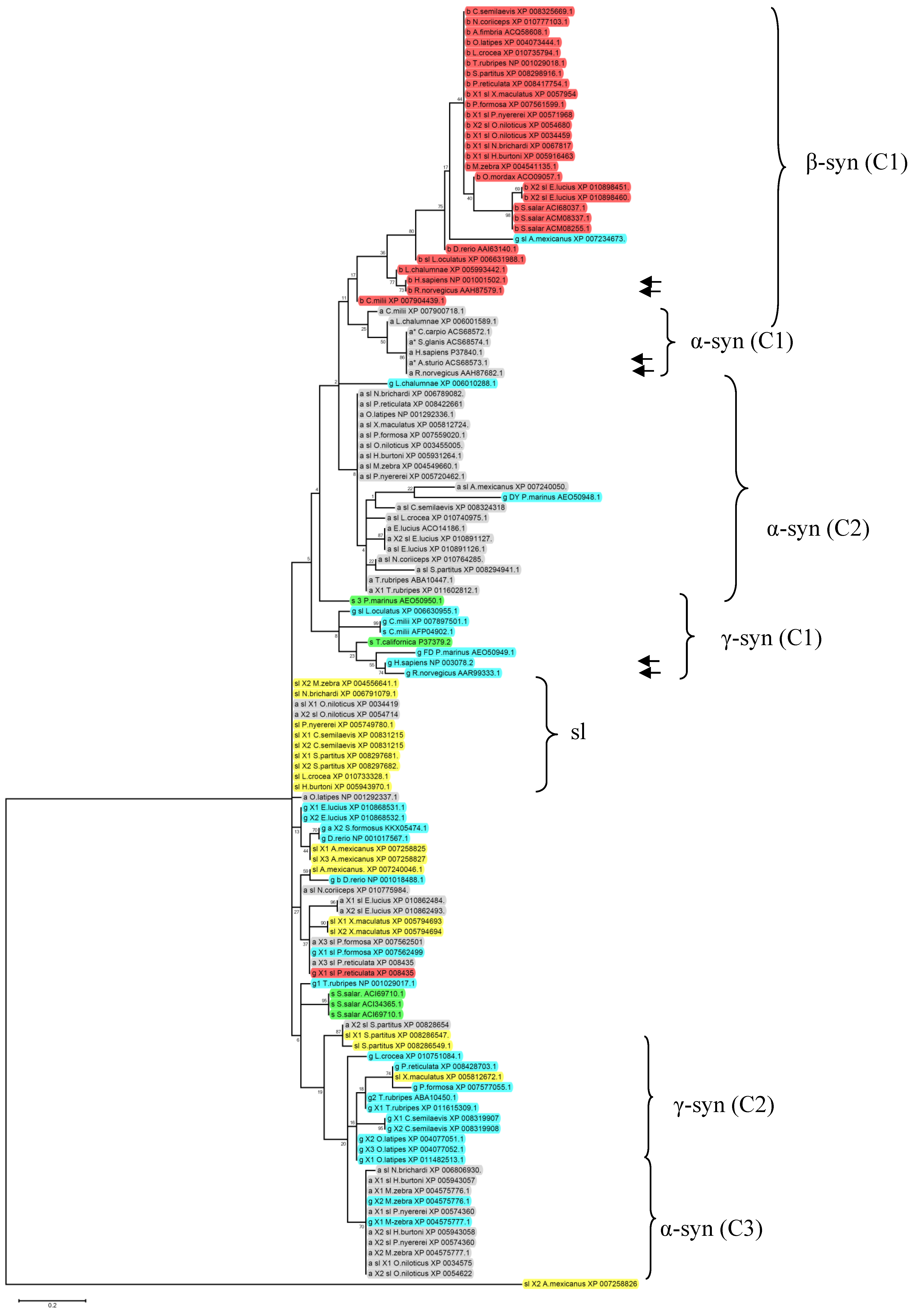 At least one coding sequence for α-syn was predicted in the other fish except from Lepisosteus ocellatus, Scleropages formosus, Osmerus mordax, Salmo salar and Anoplopoma fimbri (Table 1). In most of them, one or more β- and γ-syn sequences were also identified.