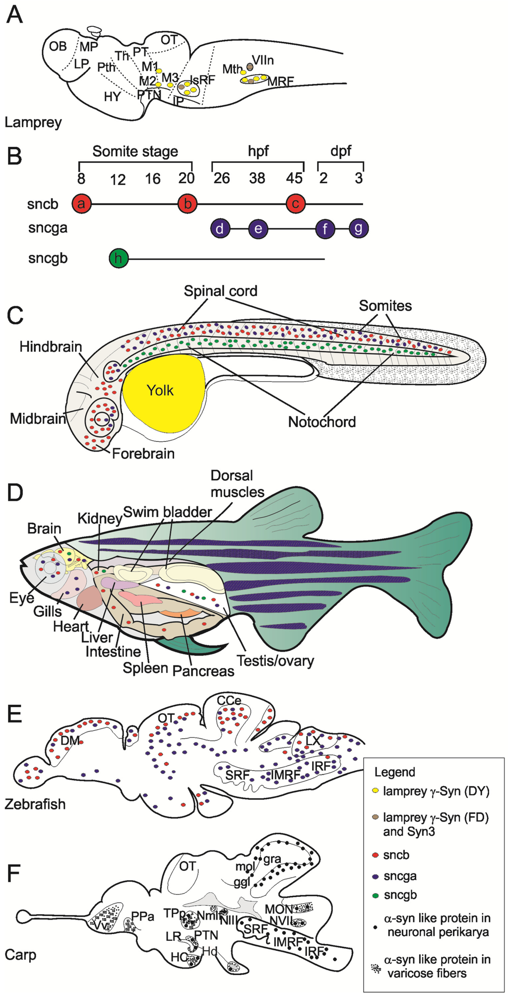 Synuclein expression in lamprey, zebrafish and carp. (A) Schematic representation of syn gene expression in a parasagittal section of the adult lamprey brain drawn on the base of data published by [66]; (B) Temporal expression pattern of syn genes in zebrafish embryo as described by [70]. The expression of sncb was initially detected in the trigeminal placode (a), then it expanded to ventral diencephalon, olfactory placode, ventral tegmentum, spinal cord neurons (b) and finally it was restricted to the brain and retina (c). The expression of sncga was initially detected in spinal cord neurons and pineal gland (d), afterwards it was detected in hindbrain neurons (e), then it was much prominent in brain and cranial ganglia (f) and finally sncga expression was restricted to the brain and retina (g). The expression of sncgb showed a different spatio-temporal distribution limited only to notochord (h); (C) Spatial expression pattern of syn genes in zebrafish embryo at 24 hpf (h post fertilization) as described by [71]. The sncgb expression is restricted to the notochord, whereas sncb and sncga are expressed in the brain and spinal cord. Red, blue and green dots indicate sncb, sncga and sncgb expression, respectively; (D): Syn genes expression pattern in the main organs of adult zebrafish on the base of results of [72]. Red, blue and green dots indicate sncb, sncga and sncgb expression, respectively; (E): Schematic representation of sncb and sncga expression pattern in a parasagittal section of the adult zebrafish brain drawn on the base of data published by [71]. Red, blue and green dots indicate sncb, sncga and sncgb expression, respectively. The different expression pattern of the two syn genes is well evident: sncb showed a most rostral expression whereas sncga showed a more intensive expression in posterior brain regions; (F): Schematic representation of the expression of α-syn-like proteins in a parasagittal section of the adult carp brain drawn on the base of data published in [73]. Large black dots indicate 3D5 immunoreactive perikarya and small black dots indicate 3D5 immunoreactive varicose fibers.