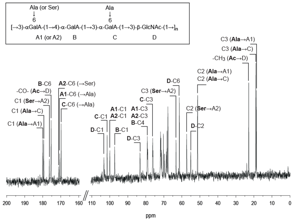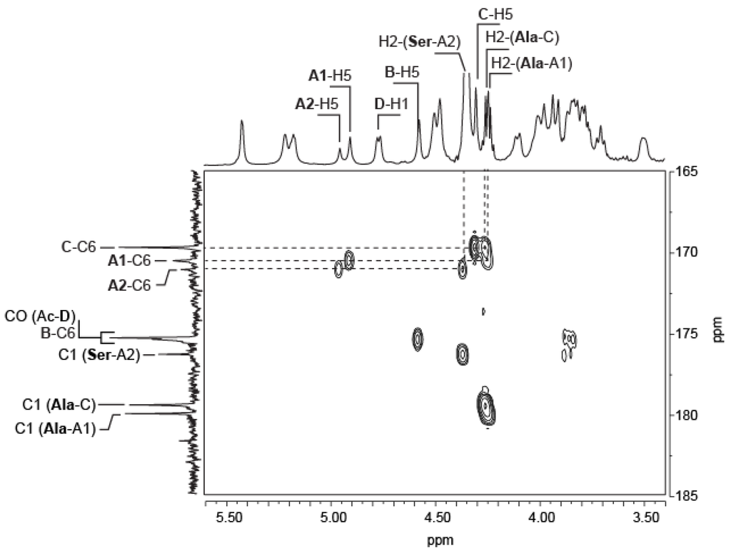 The position of the amino acids on the polysaccharide and on the purified oligosaccharides was deduced from the 2D HMBC spectra. Figure 5 shows a close-up of the HMBC recorded on the polysaccharide highlighting the coupling of the H2 protons of alanine and serine to the C6 carbons involved in the amide linkages (A1-C6, A2-C6 and C-C6). Two different d-alanines were observed, the first was linked to the A1 GalA residue and the second to the C galacturonic acid residue. The d-serine was coupled only to the A2 GalA residue. Integration of the A1-H5 (4.91 ppm) and A2-H5 (4.96 ppm) protons indicated that about 65% of A residues were decorated with d-alanine and other 35% with d-serine.