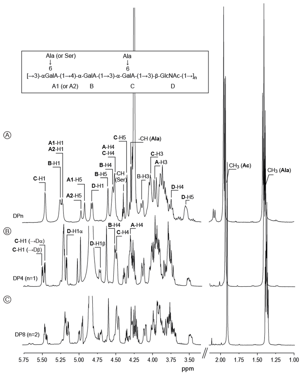 The fractions collected at elution times of 135–145 min contained a single oligosaccharide whose spectra showed similar characteristics to the polymer and the DP4. The α- and β-anomeric protons of the d-GlcNAc were present, as observed for the DP4, at 5.18 ppm and 4.73 ppm. The anomeric protons of the α-d-GalA (C) residues linked to the d-GlcNAc were also present, but signal intensity was different. Integrations of C-H1 (Dα) and C-H1 (Dβ) revealed a 1:2.3 ratio (Figure 2B) instead of a 1:0.6 ratio (Figure 2C) observed for the DP4, suggesting that one C residue was linked to d-GlcNAc (α- and β-anomer) located at the reducing end and one C residue was linked to d-GlcNAc (β-anomer) located within the oligosaccharide. The COSY spectra distinguished α-GalA (A) residues located at the non-reducing end from those linked to d-GlcNAc (the corresponding signals are indicated in Figure 2C). Altogether, integration of the anomeric protons, as well as complete assignment of the proton and carbon chemical shifts (Table 2 and Table 3) confirmed that this oligosaccharide was an octasaccharide made of two DP4 repetition moieties.
