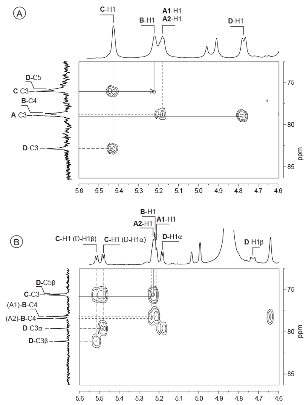 We assigned the ring protons of the three α-anomeric residues (A–C) starting from the anomeric protons A-H1, B-H1 and C-H1 by successfully combining correlation spectroscopy (COSY) and total COSY (TOCSY) analyses (Table 2). The chemical shifts of the corresponding carbons were determined using 1H/13C heteronuclear single-quantum correlation (HSQC) and are reported in Table 3.