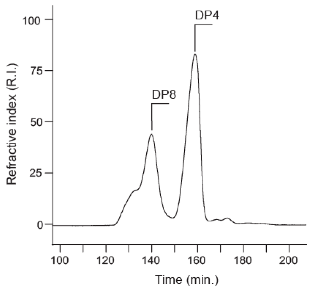 Size-exclusion chromatogram of the acid-hydrolyzed Vibrio alginolyticus exopolysaccharide. The two main products, DP4 and DP8, are indicated.