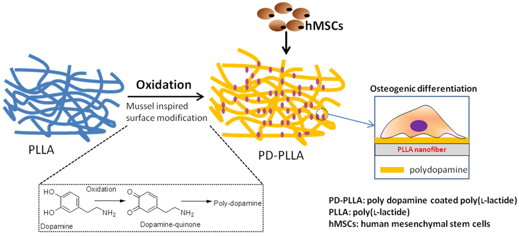 The effect of polydopamine coated Poly (l-lactide) (PLLA) fibers on the adhesion, proliferation and osteogenic differentiation of human mesenchymal stem cells (hMSCs). Adapted with permission from [36]. Copyright © Elsevier, 2012.