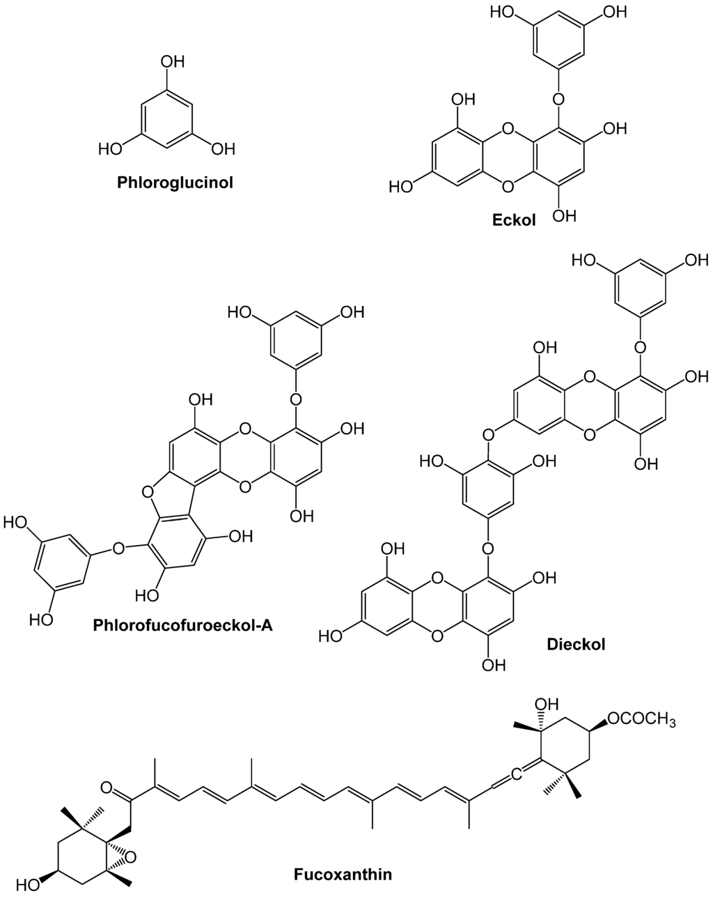 Chemical structures of some phlorotannins (phloroglucinol, eckol, phlorofucofuroeckol-A and dieckol) and fucoxanthin.