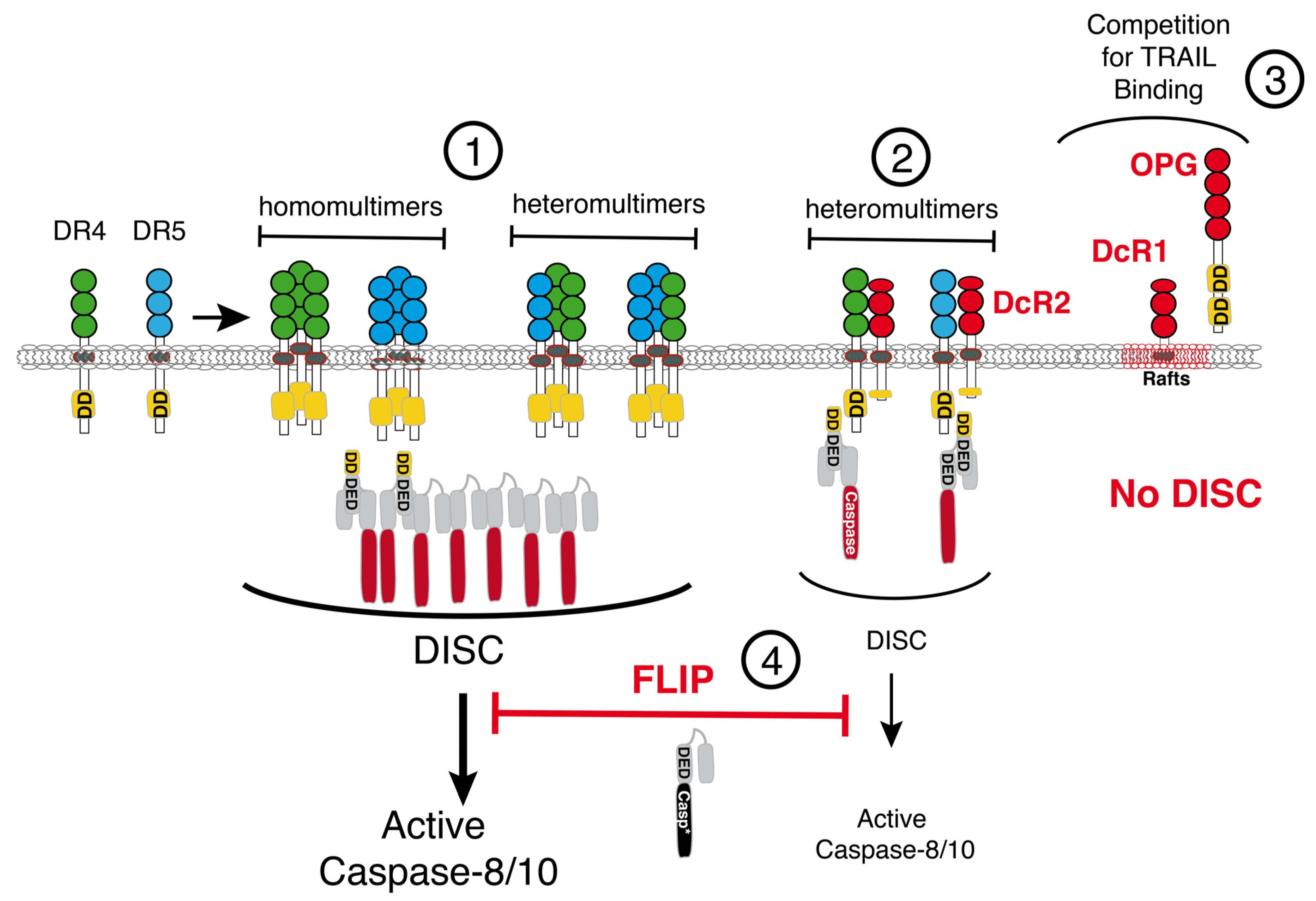 Schematic representation of TRAIL pro-apoptotic proximal signaling regulation. Apoptosis induced by TRAIL is initiated through homo/or hetero-oligomerization of DR4 and/or DR5 and subsequent chain assembly of initiator caspases (1). Proximal activation of caspase-8 by these receptors can be inhibited by TRAIL antagonistic receptors DcR2 (2), DcR1, and OPG (3), as well as by the cellular caspase-8 inhibitor, c-FLIP (4) (see text for explanations).
