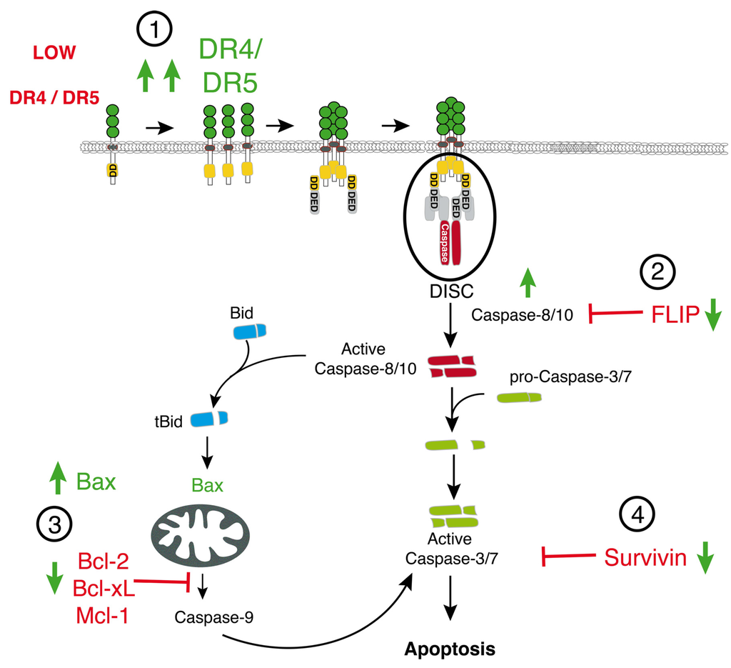 Schematic representation of the main TRAIL signaling or regulator components targeted by conventional chemotherapies to restore TRAIL-induced apoptosis. Restoration of apoptosis induced by TRAIL in resistant tumor cells can be induced through restoration of DR4 and/or DR5 (1), caspase-8/10 (2), or Bax expression (3), or down-regulation of anti-apoptotic factors such as c-FLIP (2), Bcl-2 family proteins (Bcl-2, Mcl-1, or Bcl-xL (3)), and/or survivin or XIAP (4).