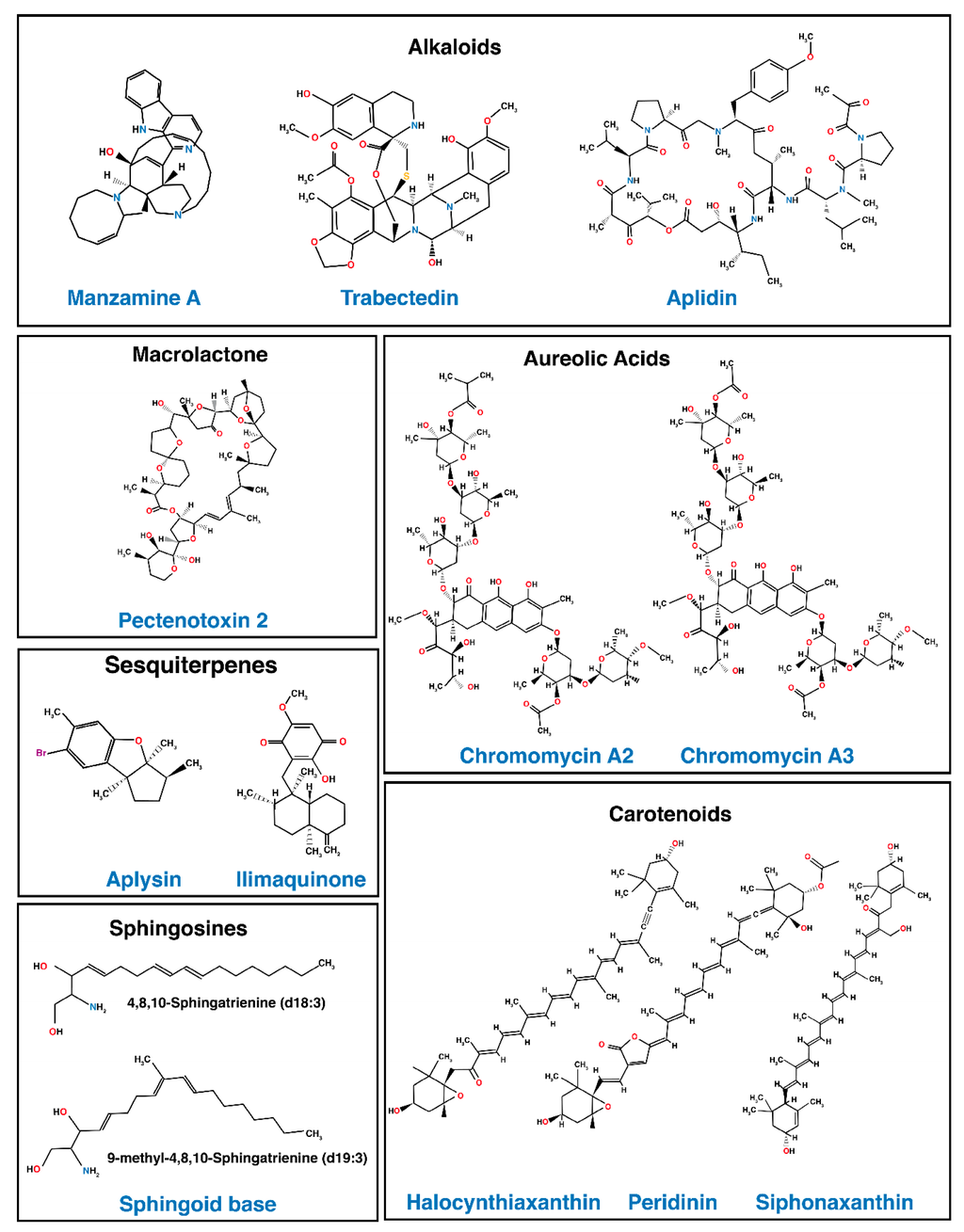 Restoration or enhancement of apoptosis induced by TRAIL in resistant cancer is a prerequisite for the use of TRAIL in the clinic [167,168]. Exploration of natural products derived from terrestrial plants and marine fauna or flora pharmacopeia is, thus, likely to provide potent and selective TRAIL-sensitizing compounds [169,170,171,172]. The marine environment is enriched with a wide variety of living organisms, including bacteria, actinobacteria, sponges, fungi, microalgae, soft corals, seaweeds and flowering plants, such as mangroves, which have been reported as unexplored source for the discovery of potential anti-cancer compounds [173], as well as anti-bacterial, anti-fungal, antioxidants, or immunomodulatory activities [173,174,175]. This biomass diversity is considered as an unlimited source of structurally novel bioactive compounds, whose structural novelties, as well as variation in chemical features, confer to these organisms unique properties allowing them to survive in extreme marine environmental conditions, such as high salinity, temperature, or pressure [176,177,178]. Several natural marine products have been reported for their potent TRAIL-sensitizing effect in various TRAIL-resistant cancer cell lines (Table 1 and Figure 4) [171,179].
