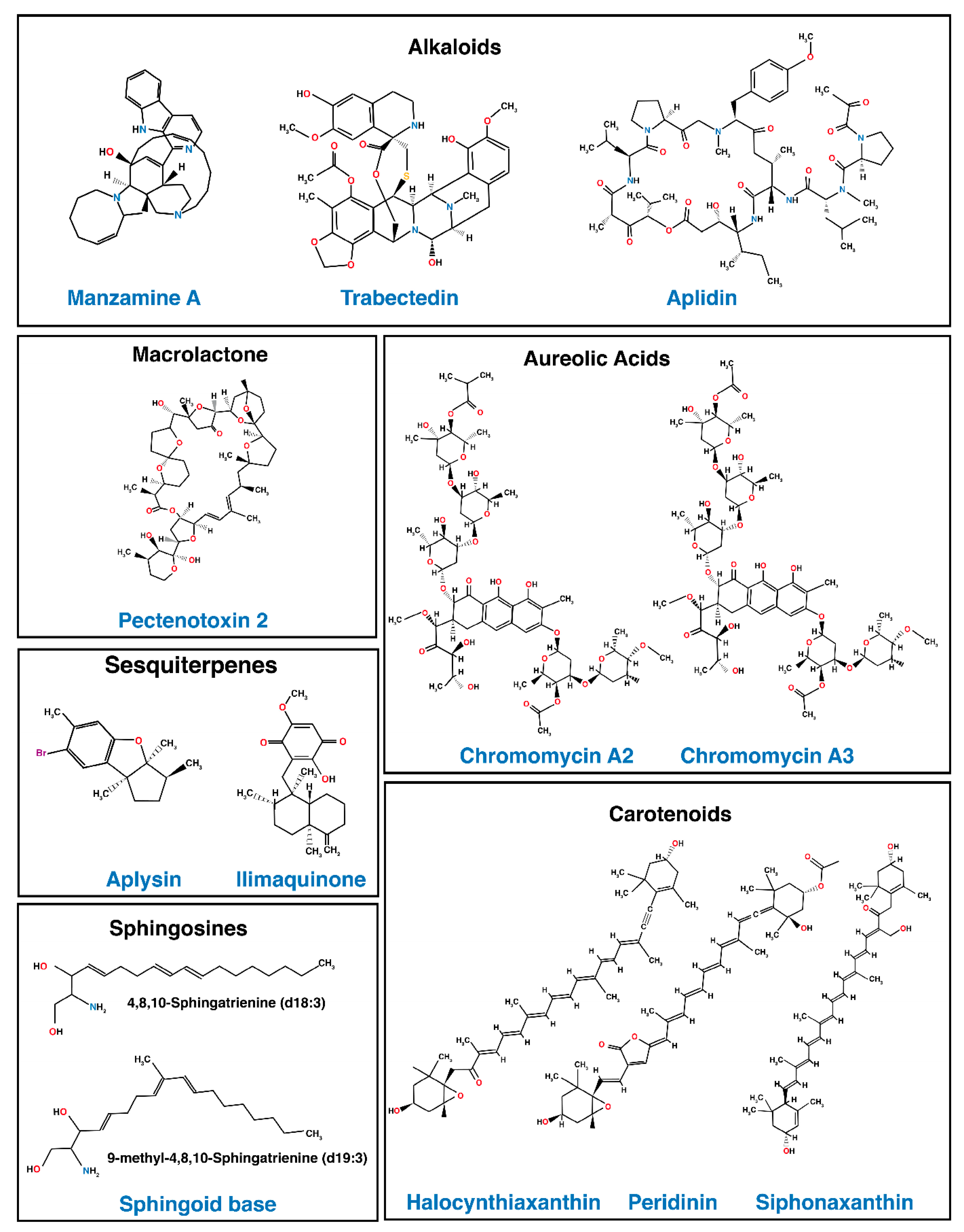 - Leal, M.C.; Puga, J.; Serodio, J.; Gomes, N.C.; Calado, R. Trends in the discovery of new marine natural products from invertebrates over the last two decades—Where and what are we bioprospecting? PLoS ONE 2012, 7. [Google Scholar] [CrossRef] [PubMed]