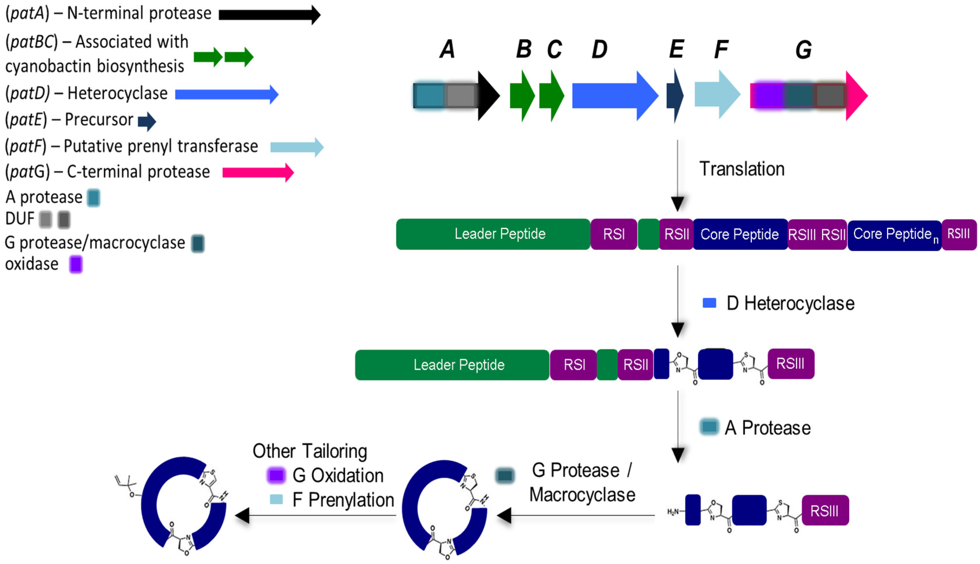- Agarwal, V.; Pierce, E.; McIntosh, J.; Schmidt, E.W.; Nair, S.K. Structures of Cyanobactin Maturation Enzymes Define a Family of Transamidating Proteases. Chem. Biol. 2012, 19, 1411–1422. [Google Scholar] [CrossRef] [PubMed]