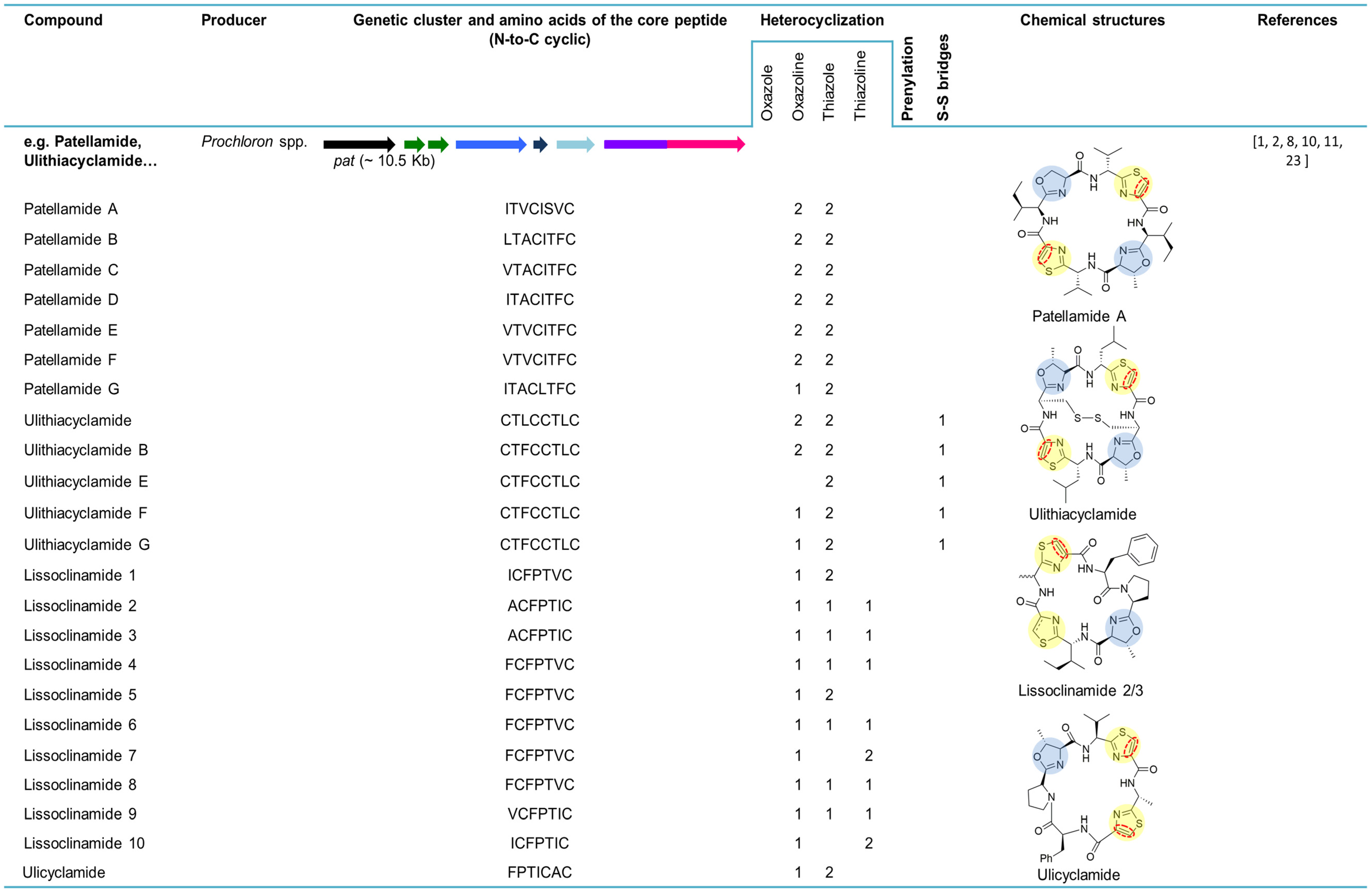 5.1. Ulicyclamide, Ulithiacyclamides, Patellamides and Lissoclinamides