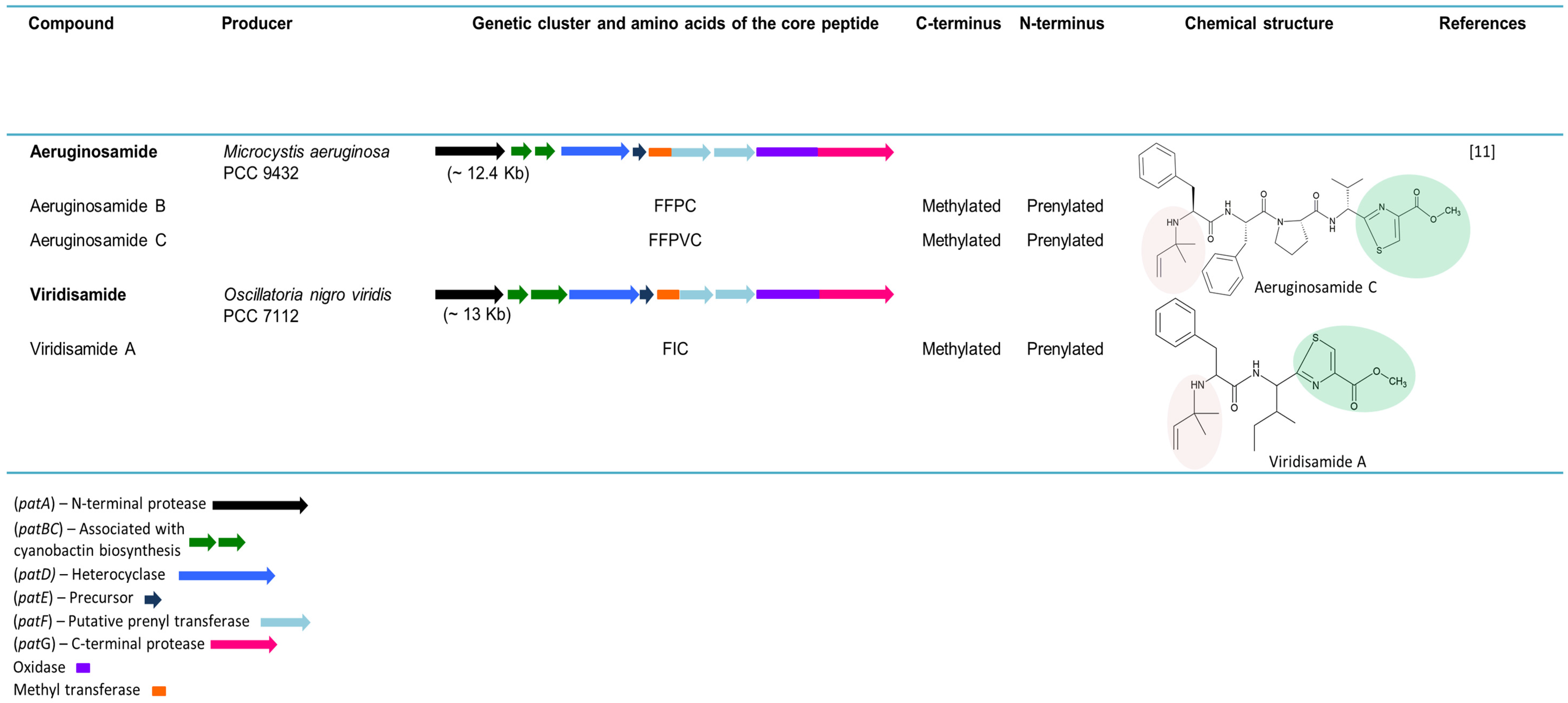 5.9. Aeruginosamides and Viridisamide—Linear Cyanobactins