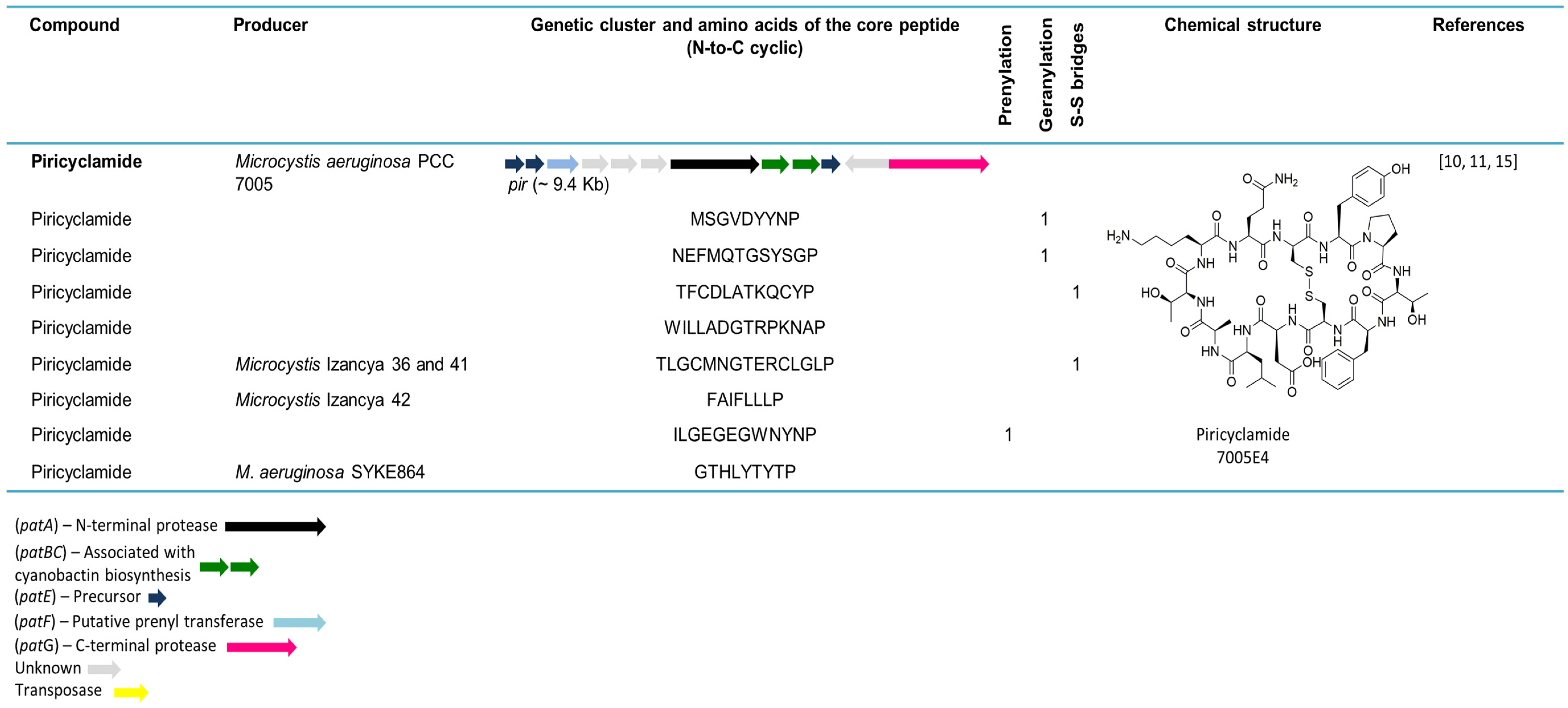 - Leikoski, N.; Liu, L.; Jokela, J.; Wahlsten, M.; Gugger, M.; Calteau, A.; Permi, P.; Kerfeld, C.A.; Sivonen, K.; Fewer, D.P. Genome Mining Expands the Chemical Diversity of the Cyanobactin Family to Include Highly Modified Linear Peptides. Chem. Biol. 2013, 20, 1033–1043. [Google Scholar] [CrossRef] [PubMed]