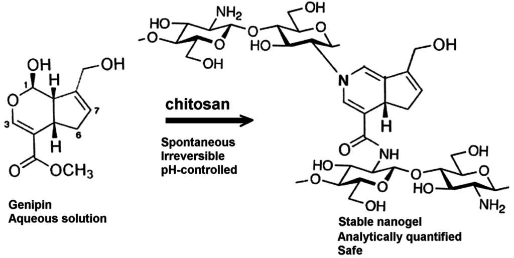 Genipin reacts promptly with chitosan, as well as with proteins or amines in general [], as a bi-functional crosslinking compound, thus producing blue-colored fluorescent hydrogels. The reaction between chitosan and genipin is well understood for a variety of experimental conditions and yields composites and complexes with no cytotoxicity for human and animal cells (Figure 1).