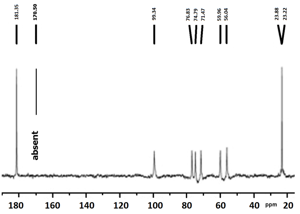 13C NMR spectrum of chitosan film crosslinked with genipin 0.10%. At 23.0 ppm the resonance signal of alkyl groups in the crosslinked chitosan was attributed to the chitosan + genipin linkage. The signal at 170.5 ppm, assigned to the ester group of plain genipin, disappeared as a consequence of the reaction, thus the resonance at 181.3 ppm is assigned to the amide generated by the reaction between the amino group of chitosan and the ester group of genipin.