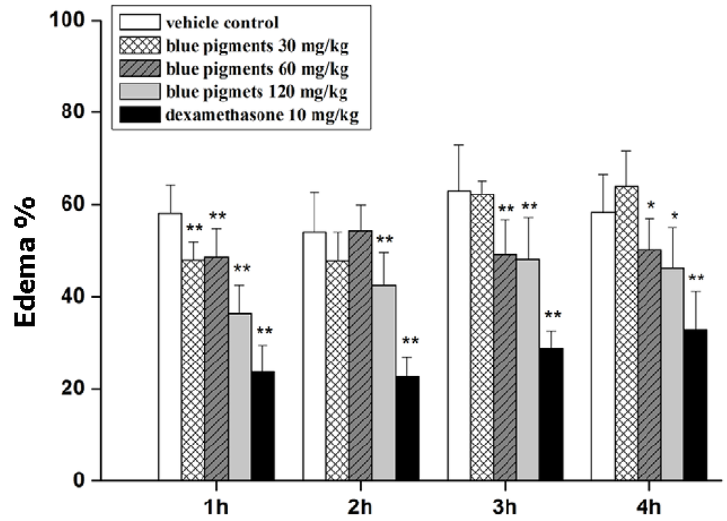 Anti-inflammatory effect of genipin + glycine blue pigment on edema in mice. Maximum edema depression was observed 1 h after edema induction. Notably, treatment with blue pigments at 120 mg/kg reduced edema by ca. 22% (from ca. 60% to 38%) at 1 h, whereas the positive control, dexamethasone (10 mg/kg) depressed the edema by ca. 35% at 1 h. The data are indicative of the safety of genipin which alleviates inflammation by exerting biochemical actions favorable to the organism. Reproduced from [].