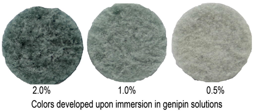 Covalent crosslinking with genipin of chitosan alginate microcapsules provides significant enhancement of the microcapsule strength and resistance while maintaining the permeability. Aldana et al. reported the compatibility of genipin with other polymers such as polyvinylpyrrolidone and its suitability in making the soft, tough material for controlled drug release []. Moisture absorption can be modulated even in polyamide 6,6 fabrics when the surface is functionalized with the aid of GEN-chitosan hydrogels [].