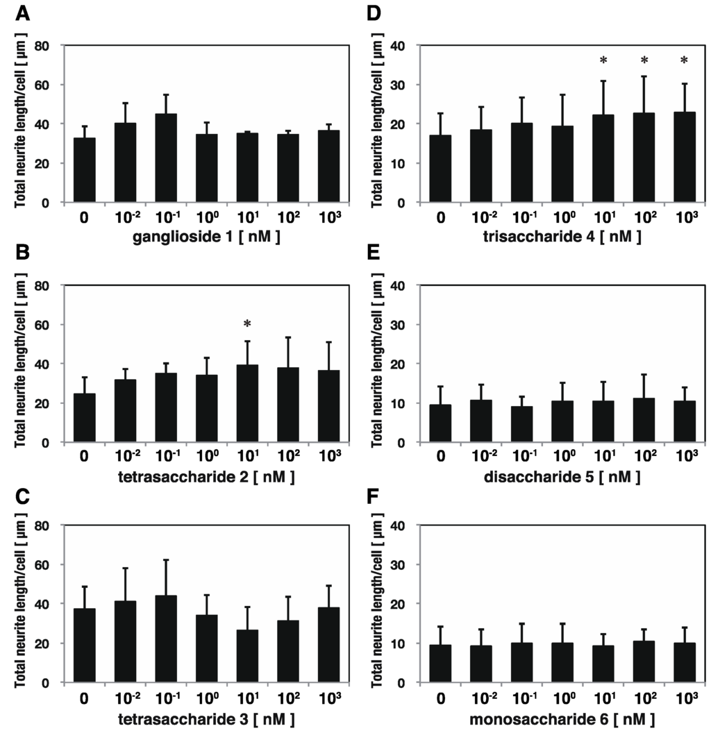 Neurite outgrowth evaluation in PC12 cells. Rat PC12 cells with a low serum culture medium containing 5 ng/mL of NGF were incubated with ganglioside 1 (A); tetrasaccharide 2 (B); tetrasaccharide 3 (C); trisaccharide 4 (D); disaccharide 5 (E) and monosaccharide 6 (F) for neurite outgrowth evaluation. The error bar represents the standard deviation (S.D.). * p < 0.05 with Dunnett’s test compared with the 0 nM group.