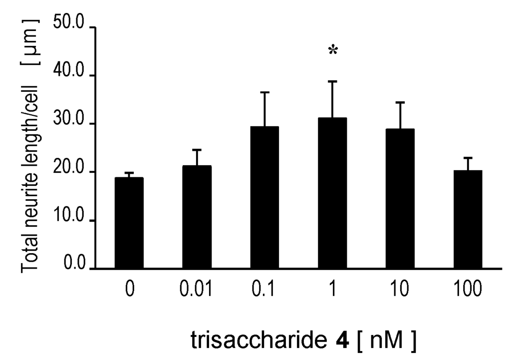 We also examined the neuritogenic activity of trisaccharide 4 in human neuroblastoma SH-SY5Y cells. Trisaccharide 4 elongated SH-SY5Y neurites cultured in low serum-containing medium. The maximum neurite length was attained when 1 nM of trisaccharide 4 was added to the cells and the increase was statistically significant (p < 0.05, Dunnett’s test) (Figure 3). The neurite length increased up to 1 nM of trisaccharide 4 in a dose-dependent manner, and then decreased at higher concentrations (Figure 3).