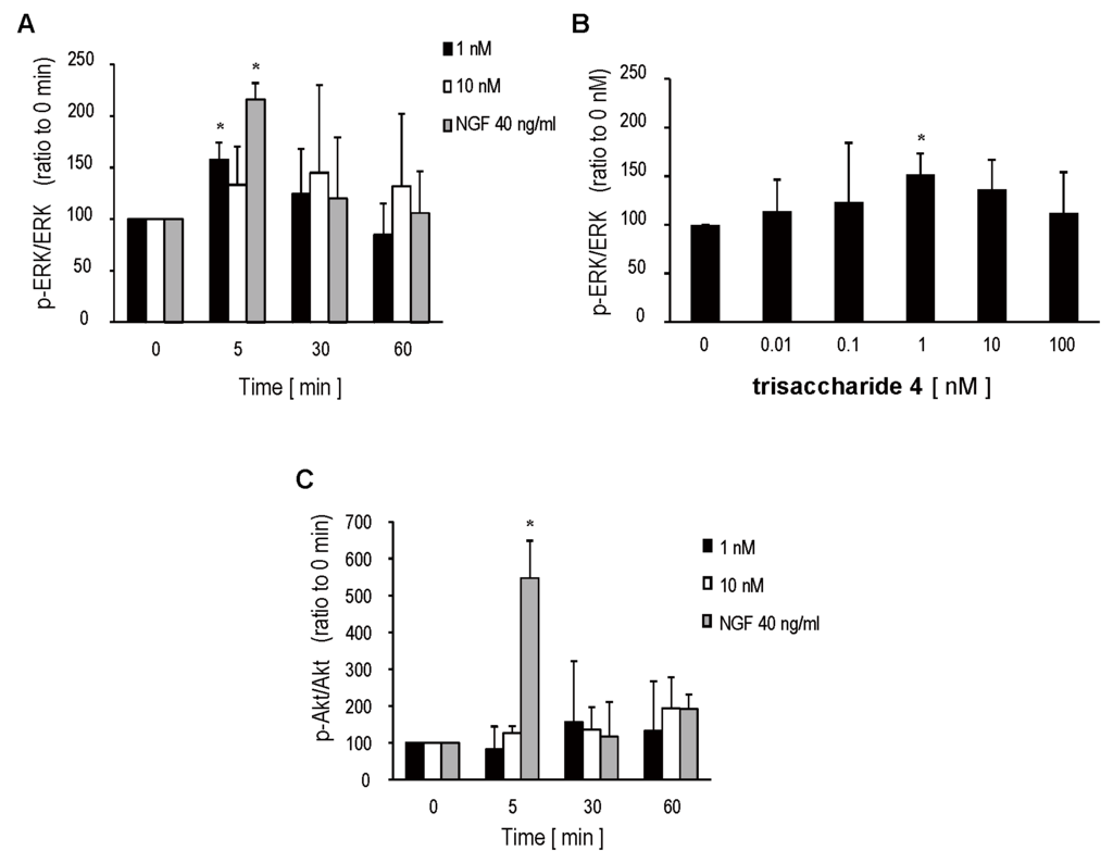 Trisaccharide 4 also induced phosphorylation of ERK after 5 min incubation dose-dependently. The relative ratio of p-ERK/ERK increased in a dose-dependent manner and reached a maximum value at 1 nM (p < 0.05, Dunnett’s test), but decreased at higher concentrations (Figure 4B). The dose dependency of ERK phosphorylation corresponded well to the results in Figure 3. However, trisaccharide 4 did not induce Akt phosphorylation significantly, although 40 ng/mL of NGF increased the relative ratio of phosphorylated Akt to Akt (p-Akt/Akt) 5 min after stimulation (547.7 ± 100.7%) (Figure 4C).