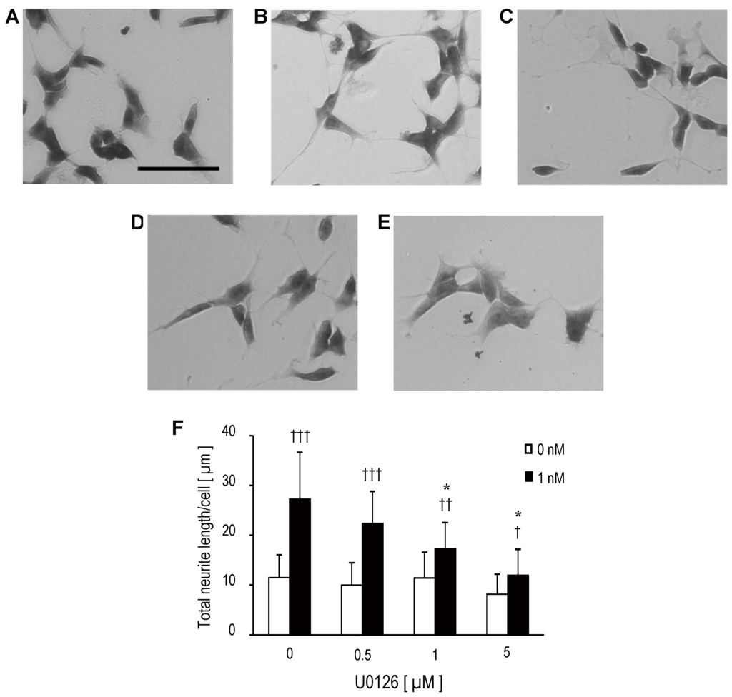 Effects of MEK inhibitor U0126 on neurite extension and ERK 1/2 phosphorylation. SH-SY5Y cells were incubated with trisaccharide 4 (A) 0 nM; (B–E) 1 nM and U0126 (A, B) 0 µM; (C) 0.5 µM; (D) 1 µM; (E) 5 µM for 3 days in medium containing 1% FBS. Mean total neurite length per cell of 180 cells was measured at each dose (F). Statistical significances were determined by Dunnett’s test compared with U0126 0 µM within each trisaccharide 4-treated group (0 or 1 nM group) (* p < 0.05) and by t-test (0 vs. 1 nM at each U0126 dose level) (††† p < 0.001, †† p < 0.01, and † p < 0.05).