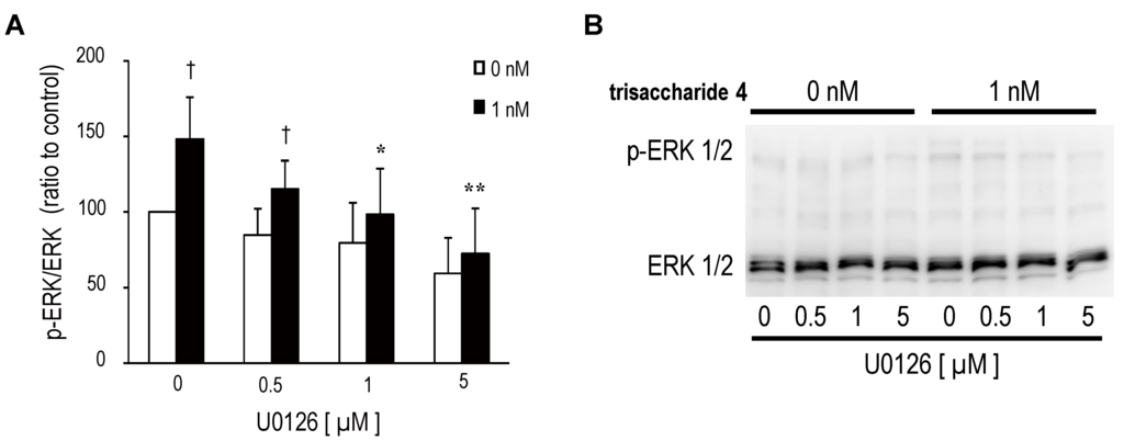 The trisaccharide 4-stimulated ERK 1/2 phosphorylation was confirmed in the presence of MEK inhibitor U0126. In brief, cells were pre-incubated with 1.8 mL/well of DMEM/F12 containing U0126 for 1 h, followed by adding 0.2 mL/well of the trisaccharide 4 (final concentration: 1 nM) for 5 min.