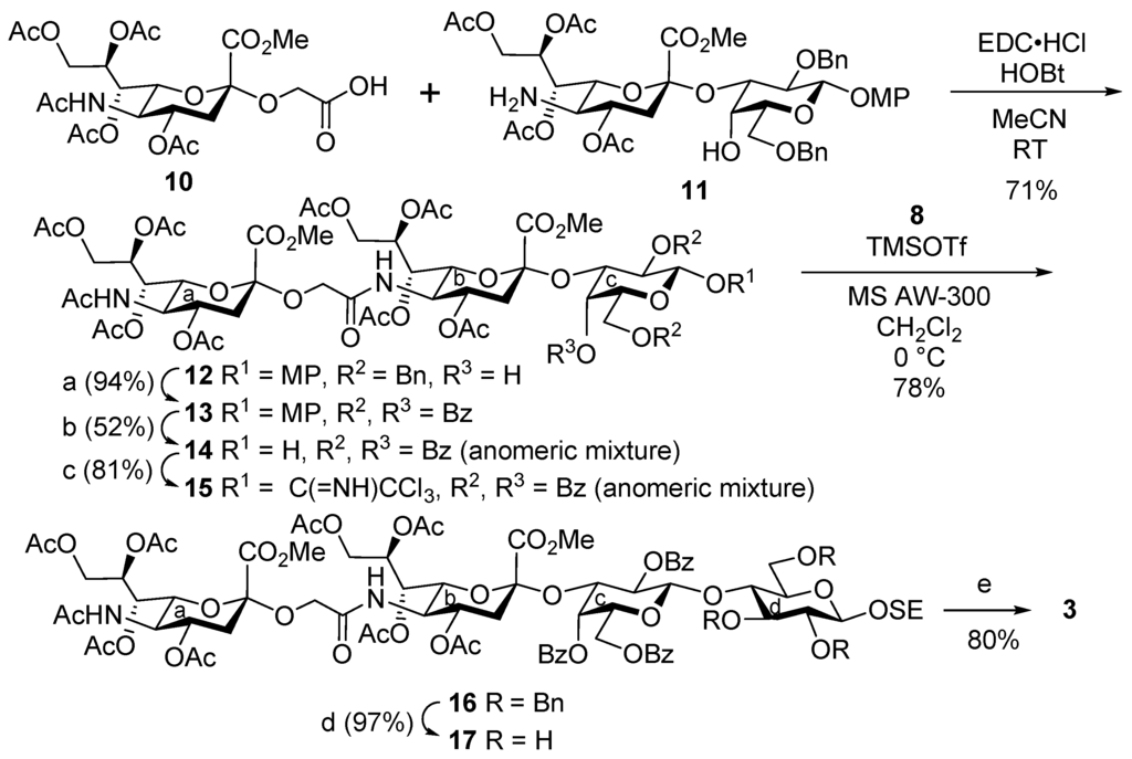 To synthesize demethylated tetrasaccharide 3, the outer trisaccharide moiety was constructed, and then it was combined with a glucose unit (Scheme 2). Thus, sialyl glycolic acid derivative 10 [48] was condensed with 5-amino-sialyl galactoside derivative 11 [40] in the presence of EDC·HCl and HOBt in MeCN to afford trisaccharide 12 in 71% yield. Next, trisaccharide 12 was converted to suitably protected glycosyl donor 15, which was analogous to 7, and 15 was then coupled with glucosyl acceptor 8, producing tetrasaccharide 16 in 78% yield. After removal of the benzyl groups from 16, a global deprotection procedure similar to that used for 9 delivered demethylated tetrasaccharide 3.