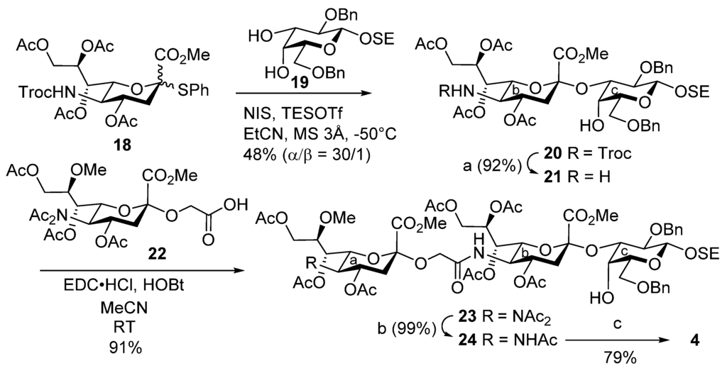 For the synthesis of trisaccharide 4, we attempted to obtain 2-(trimethylsilyl)ethyl (SE) glycoside by glycosidating trisaccharyl donor 7 with SE-OH under conventional reaction conditions (Scheme 3). However, the small amount of the stereoisomer (α-glycoside) that was also generated during the reaction showed similar mobility to the desired β-glycoside by TLC analysis, and the isomers could not be separated by chromatographic methods. To circumvent this problem, in the synthetic route in Scheme 3 suitably protected galactose 19 [49], which contained the β-SE glycoside, was used as the glycosyl acceptor in the glycosidation of sialic acid donor 18 [50], and disaccharide 20 was obtained in moderate yield. Next, selective removal of the Troc group with zinc and AcOH in MeCN and the ensuing coupling reaction using 8-Me-sialyl glycolic acid 22 [40] produced protected trisaccharide 23 in high yield. Finally, trisaccharide 23 underwent stepwise deprotection, including de-N-acetylation, demethylation, and basic ester hydrolysis, to afford 4.