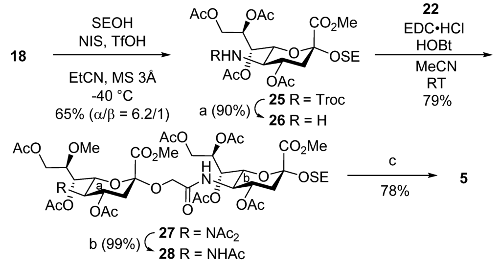 The synthesis of disaccharide 5 started with the glycosidation of sialyl donor 18 with SE-OH in the presence of NIS and TfOH [51] at −40 °C in EtCN, which was used as a stereo-directing reaction media [52] (Scheme 4). This reaction produced α-SE glycoside 25 with high stereoselectivity (α/β = 6.2/1), which was then converted to the amine derivative and condensed with 22 to afford protected disaccharide 27. Finally, 27 was treated in a similar way to trisaccharide 23, furnishing target compound 5.