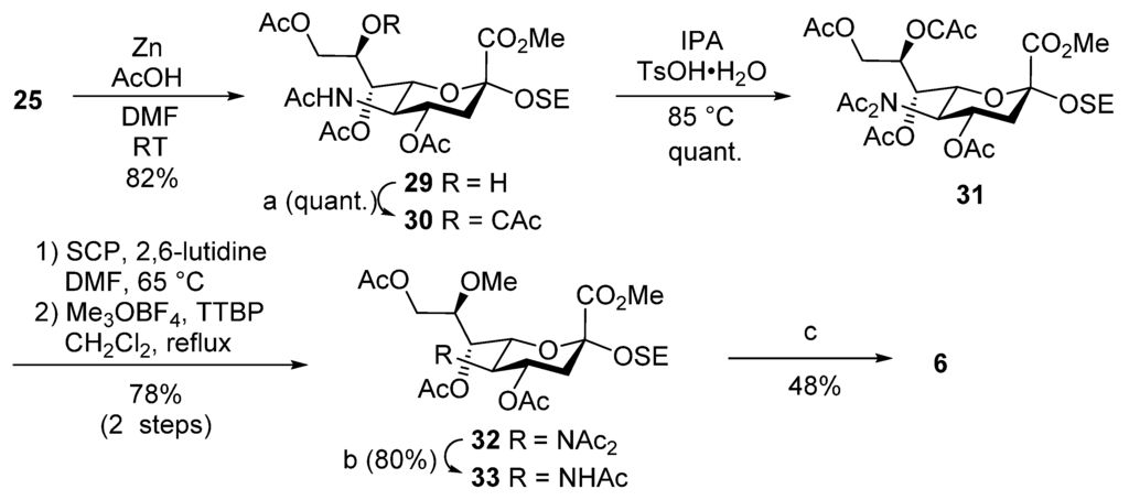 In the final part of the syntheses of the LLG-3 glycan analogues, sialyl glycoside 25 was transformed into target compound 6 based on our method for the synthesis of 8-O-methyl sialic acid-containing molecules [40] (Scheme 5). First, 25 was converted into 8-OH derivative 29 via regioselective 8O to 5N migration of the acetyl group upon treatment with zinc under acidic conditions. Then, 8-OH protection with the chloroacetyl group gave 30, and it was further modified to diacetylimide 31 by reaction with isopropenyl acetate in the presence of acid. Next, the chloroacetyl group was selectively cleaved by selenocarbamoylpiperidine [53], and the retrieved OH was methylated by Meerwein’s reagent, giving 32 in 78% yield over two steps. Finally, global deprotection produced monosaccharide 6.