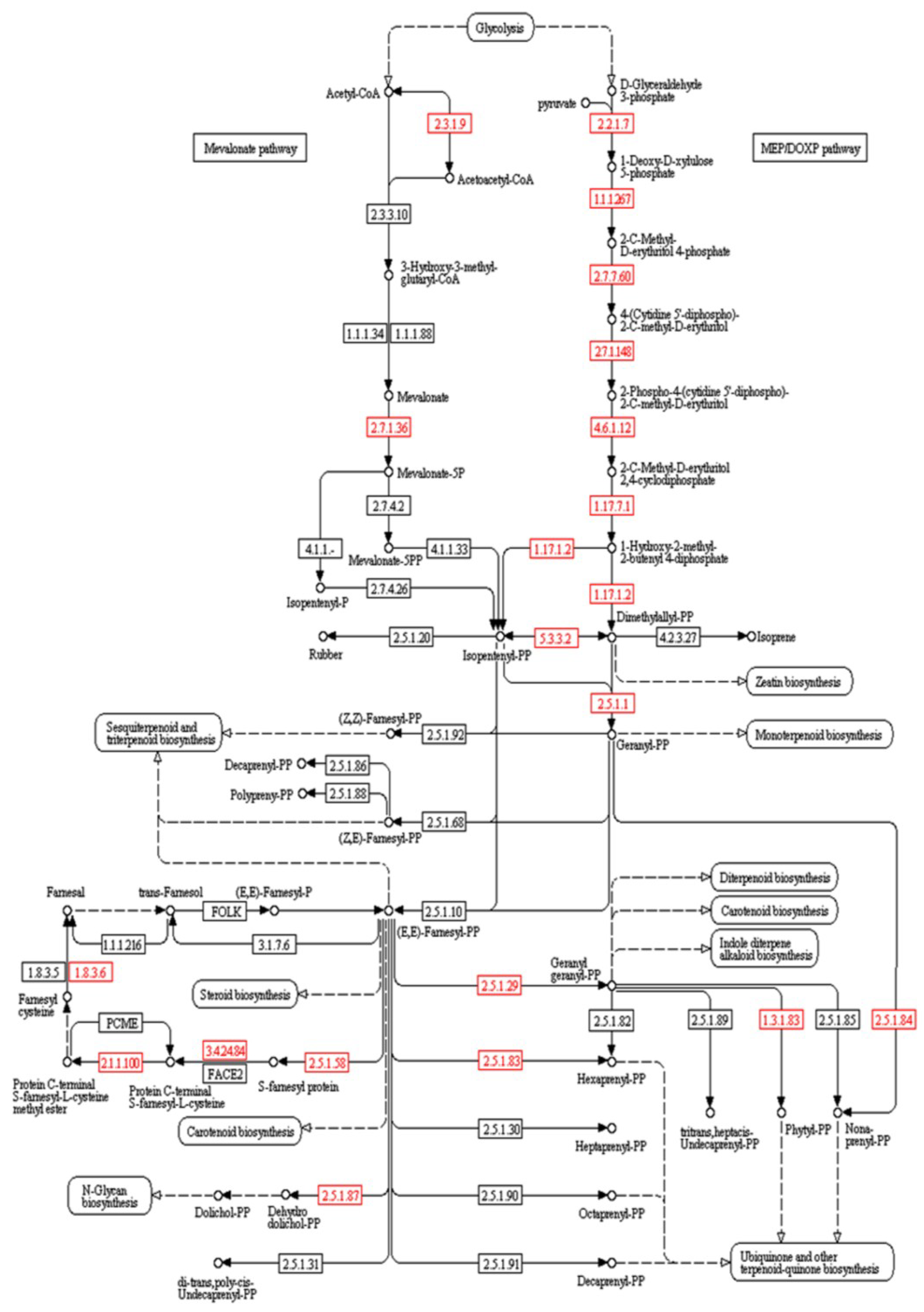 Biosynthetic routes to the terpenoid precursors through the mevalonate (MVA) pathway and the methylerythritol phosphate (MEP) pathway. The red squares represent the genes detected in the transcriptomic analysis of L. dendroidea. Modified from the Kegg Pathway Database website—Terpenoid backbone biosynthesis reference pathway [37].