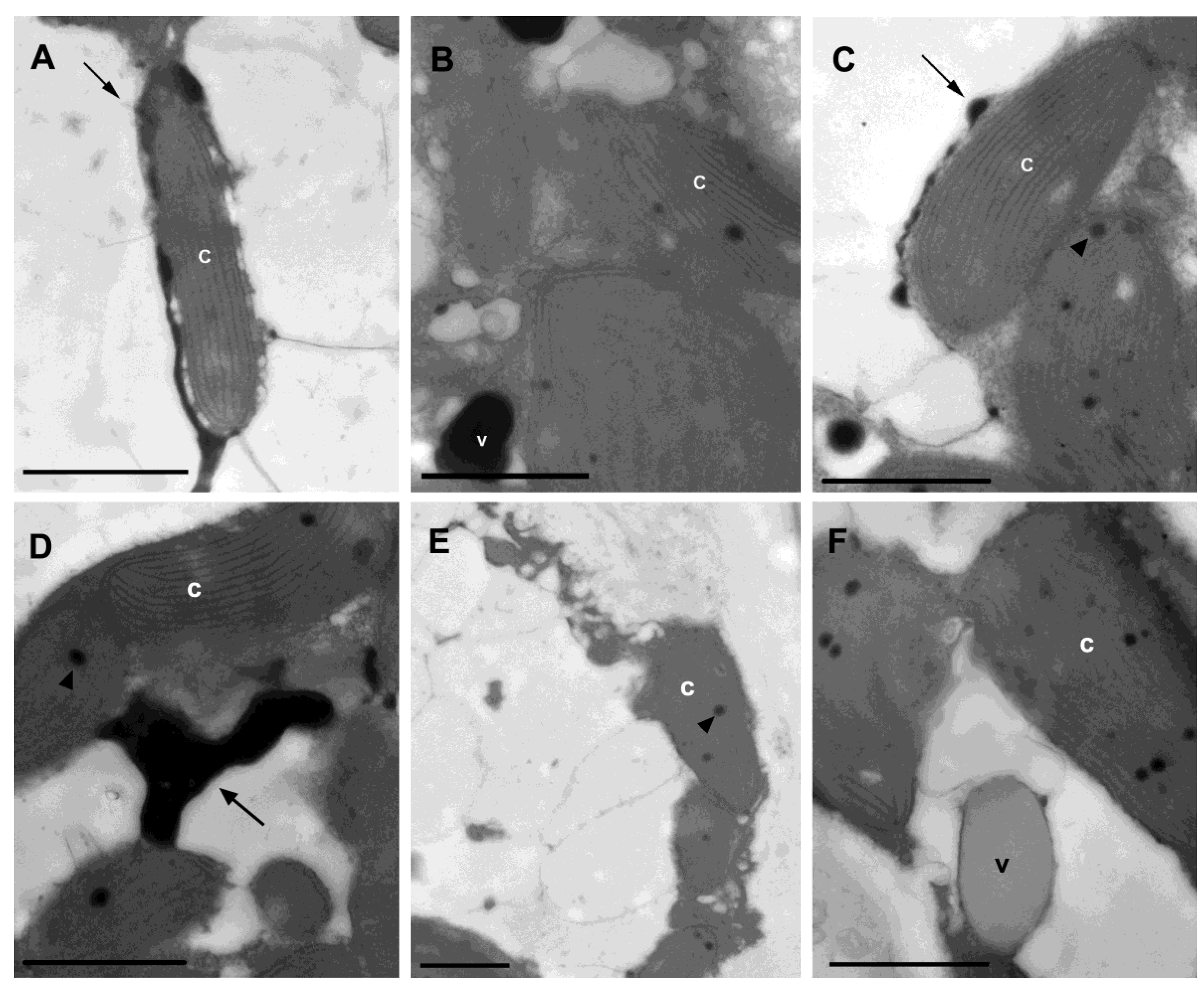 Transmission electron microscopy (TEM) images of Laurencia dendroidea spore cells submitted to cytochemical mevalonic acid enzyme assay. (A–D) indicate the spore cells submitted to the complete acetoacetyl-CoA medium, (E) indicates the cells submitted to the substrate control for acetoacetyl-CoA medium, and (F) indicates cells submitted to the reaction product control medium. In images (A–D), arrows are pointing to electron-dense granular material, indicating the HGMS/HGMR activity inside lamellar structures surrounding the chloroplasts (c) (A,C), in vesicle-like structures (v) near the chloroplasts (B), and in large lamellar structures between chloroplasts (D). In the control samples (E,F), no precipitation was verified. The arrowheads indicate plastoglobules. Bars = 1 µm.