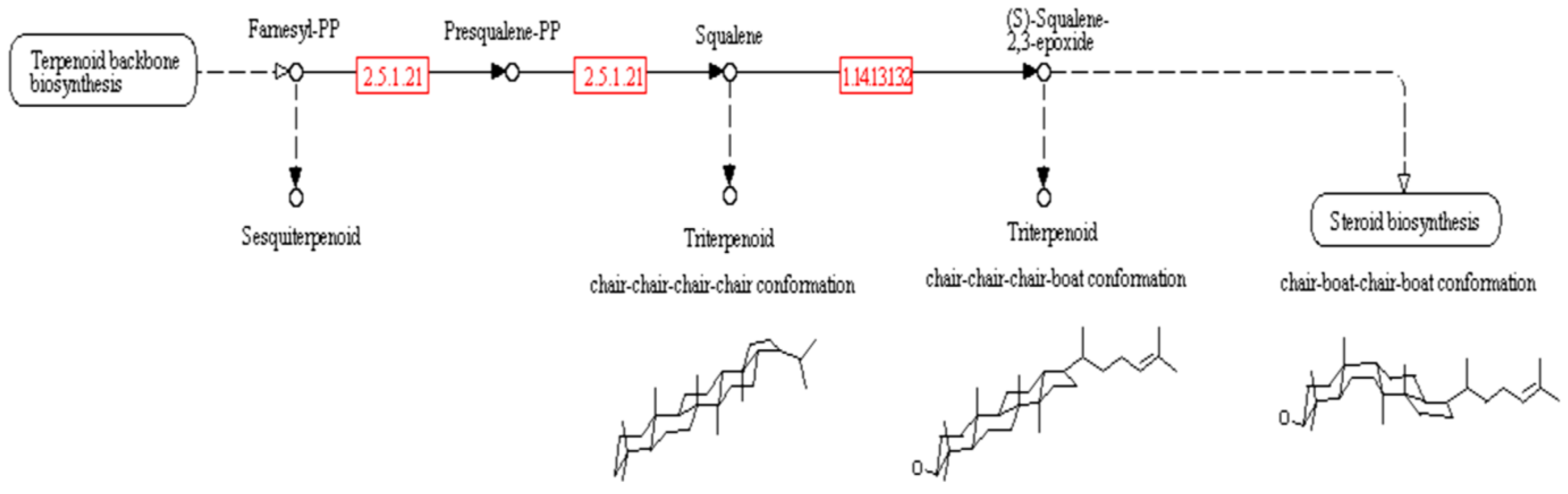 - Kanehisa, M.; Goto, S. Kegg Pathway Database: Sesquiterpenoid and triterpenoid biosynthesis—reference pathway. Available online: http://www.genome.jp/kegg-bin/show_pathway?map00909 (accessed on 15 September 2014).