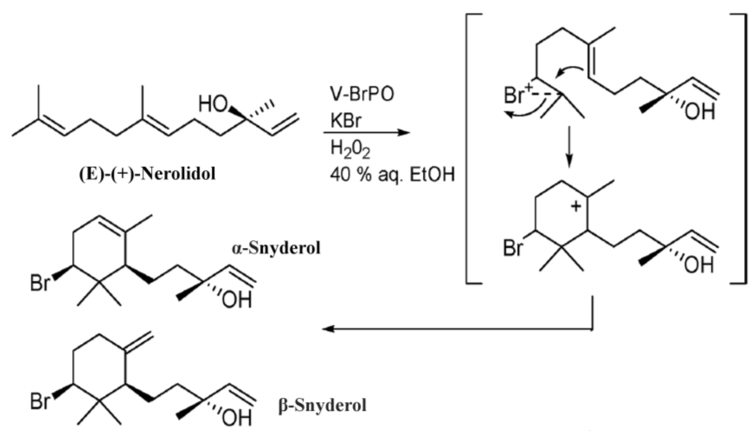 Proposed mechanism for the biosynthesis of α- and β-snyderols from (E)-(+)-nerolidol (adapted from [62]).