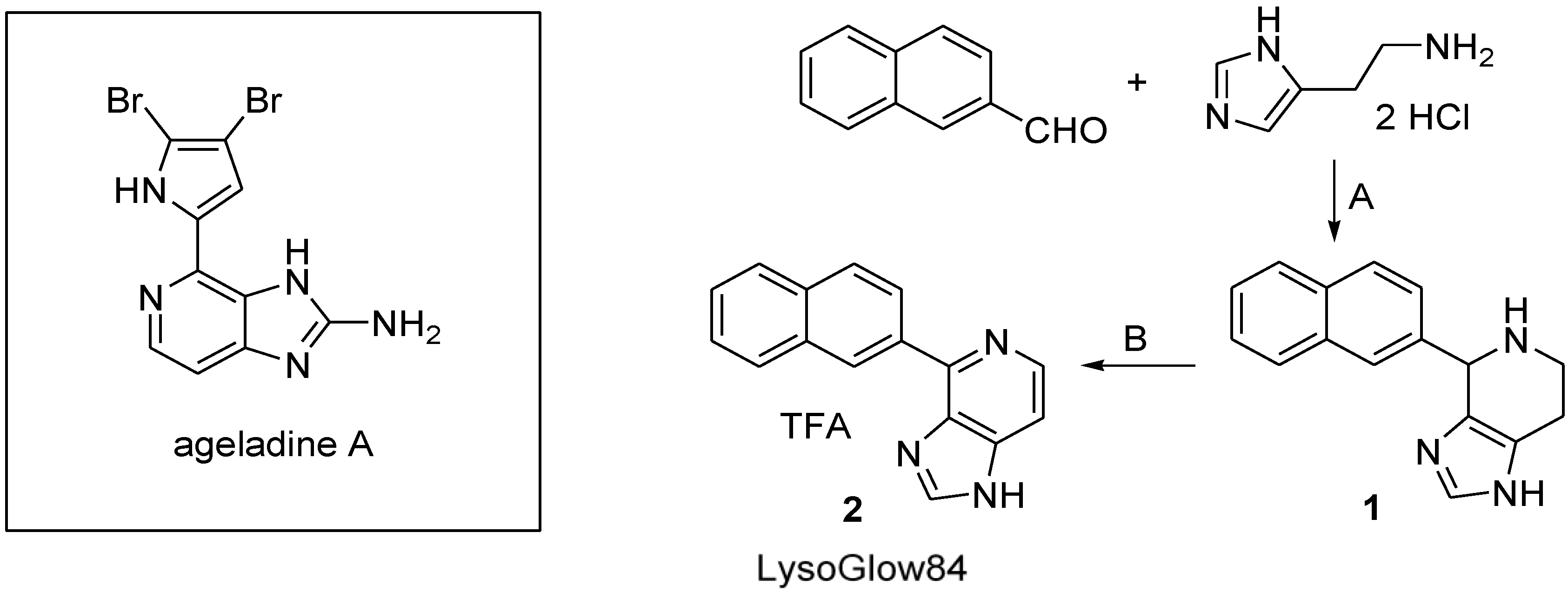 Structure of ageladine A and synthesis of 4-(naphthalene-2-yl)-1H-imidazo[4,5-c]pyridine trifluoroacetate (structure 2, LysoGlow84): A: KOH, EtOH, 24 h, 80 °C, 99%; B: (1) MnO2, pyridine, acetone, 18 h, 80 °C; (2) TFA, EtOH, diethyl ether, 71%.
