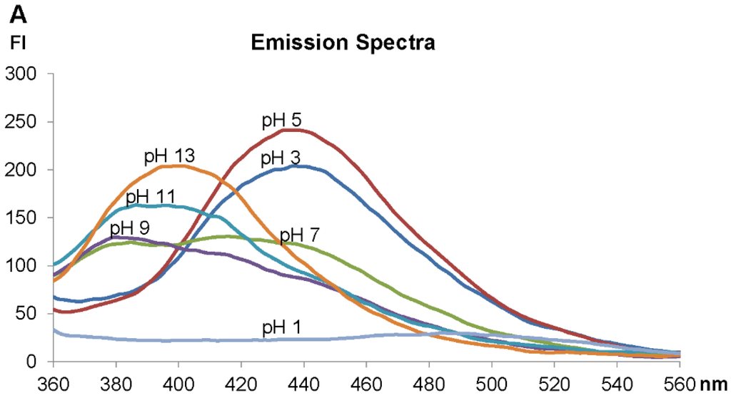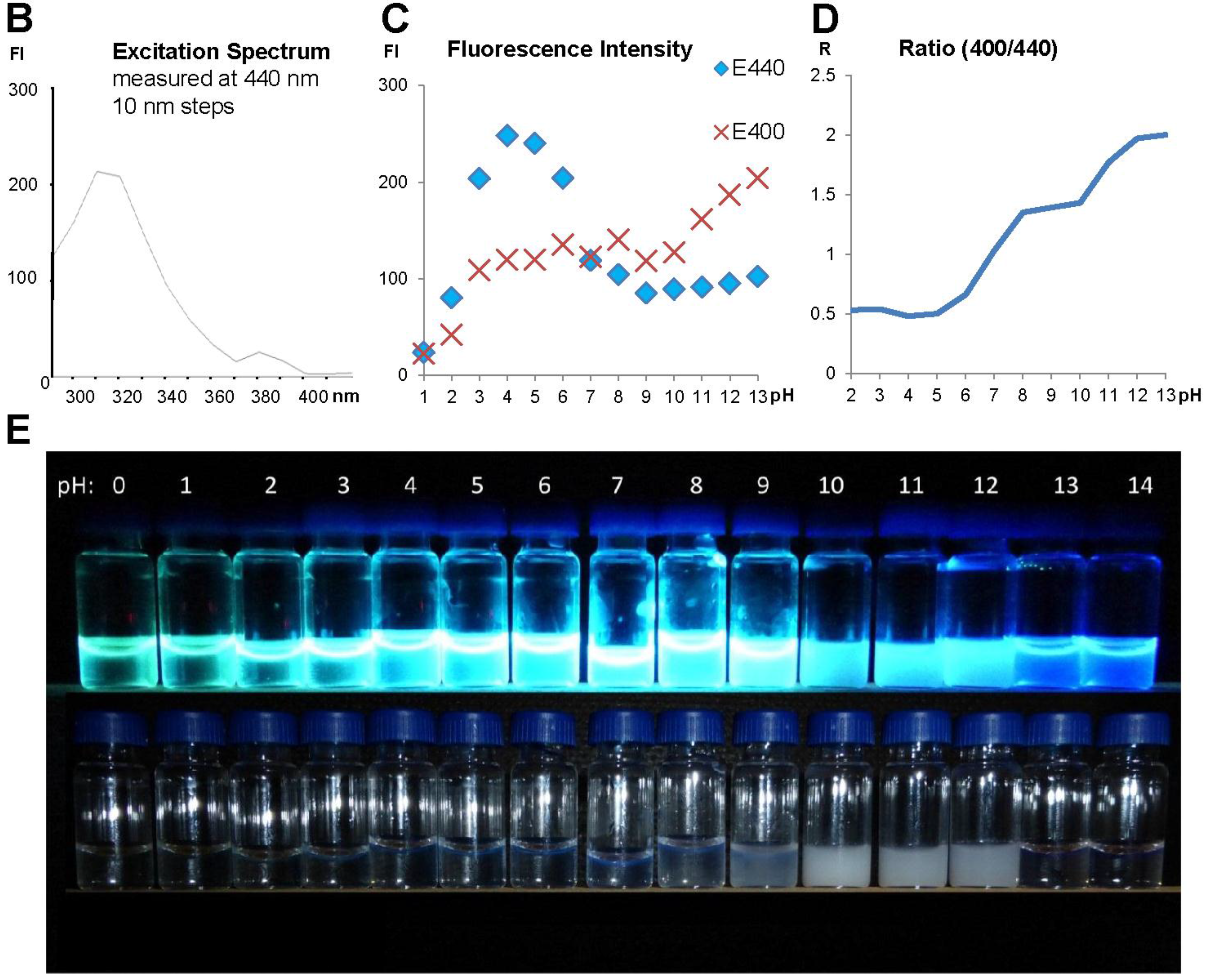 A shift in the emission maximum can be used to calculate a relationship between pH and R = I400/I440. I400 and I440 give fluorescence intensities at 400 nm and 440 nm, respectively. The ratio R strongly depends on the pH range and reaches from R = 0.5 at pH 2–pH 5 to R = 2 at pH 12. The highest resolution of R is between pH 6 and pH 8 and between pH 10 and pH 12. There is no linear relationship between pH and R value, but R can be used to determine the pH of a medium over a wide pH range with varying accuracy (Figure 3D).