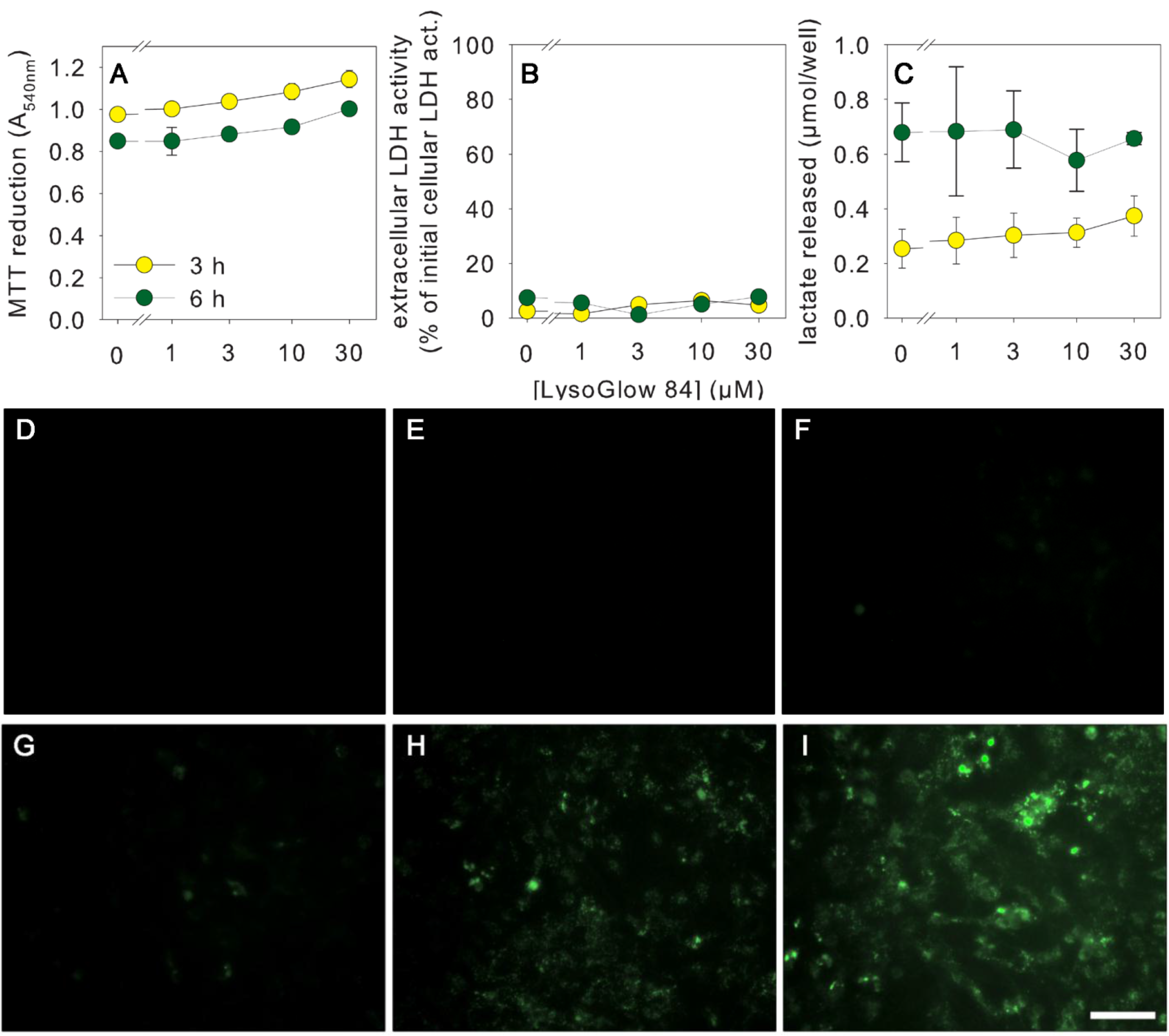 Test for acute toxicity and cellular staining of cultured astrocytes with LysoGlow84. The cells were incubated for 3 h (A–I) or 6 h (A–C) with the indicated concentrations of LysoGlow84 or with the vehicle control (DMSO). Cellular MTT reduction capacity (A), extracellular lactate dehydrogenase (LDH) activity (B) and extracellular lactate content (C) were determined. ANOVA revealed no significant difference between treatment groups. Incubation with DMSO in an amount representing the DMSO content applied with the highest LysoGlow84 concentration was for none of the parameters significantly altered (data not shown). Panel D–I show the fluorescence staining of the cultures after incubation without LysoGlow84 (controls without (D) or with DMSO (E)) or with LysoGlow84 in concentrations of 1 (F), 3 (G), 10 (H) or 30 µM (I). The scale bar in panel I represents 50 µm and applies to the panels D–I.