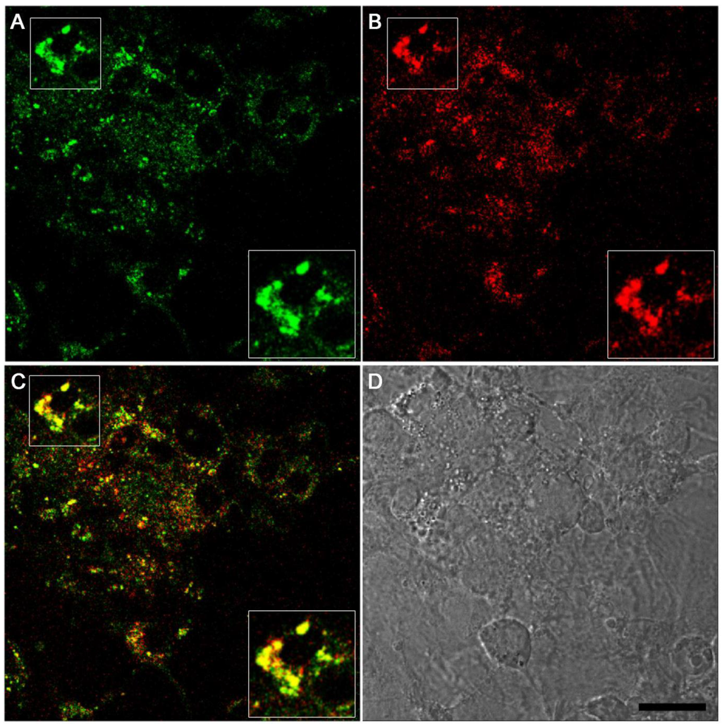 Confocal images of LysoGlow84 and LysoTracker Red fluorescence in cultured astrocytes. The cells were incubated with 10 µM LysoGlow84 and 70 nM of LysoTracker Red for 3 h at 37 °C. Images of LysoGlow84 fluorescence (A), LysoTracker Red fluorescence (B), and the overlay (C) which shows co-localization of both fluorescent dyes in yellow (highlighted in insets). Panel D shows the transmission light image of the cells. The scale bar in D represents 20.1 µm and applies to all images.