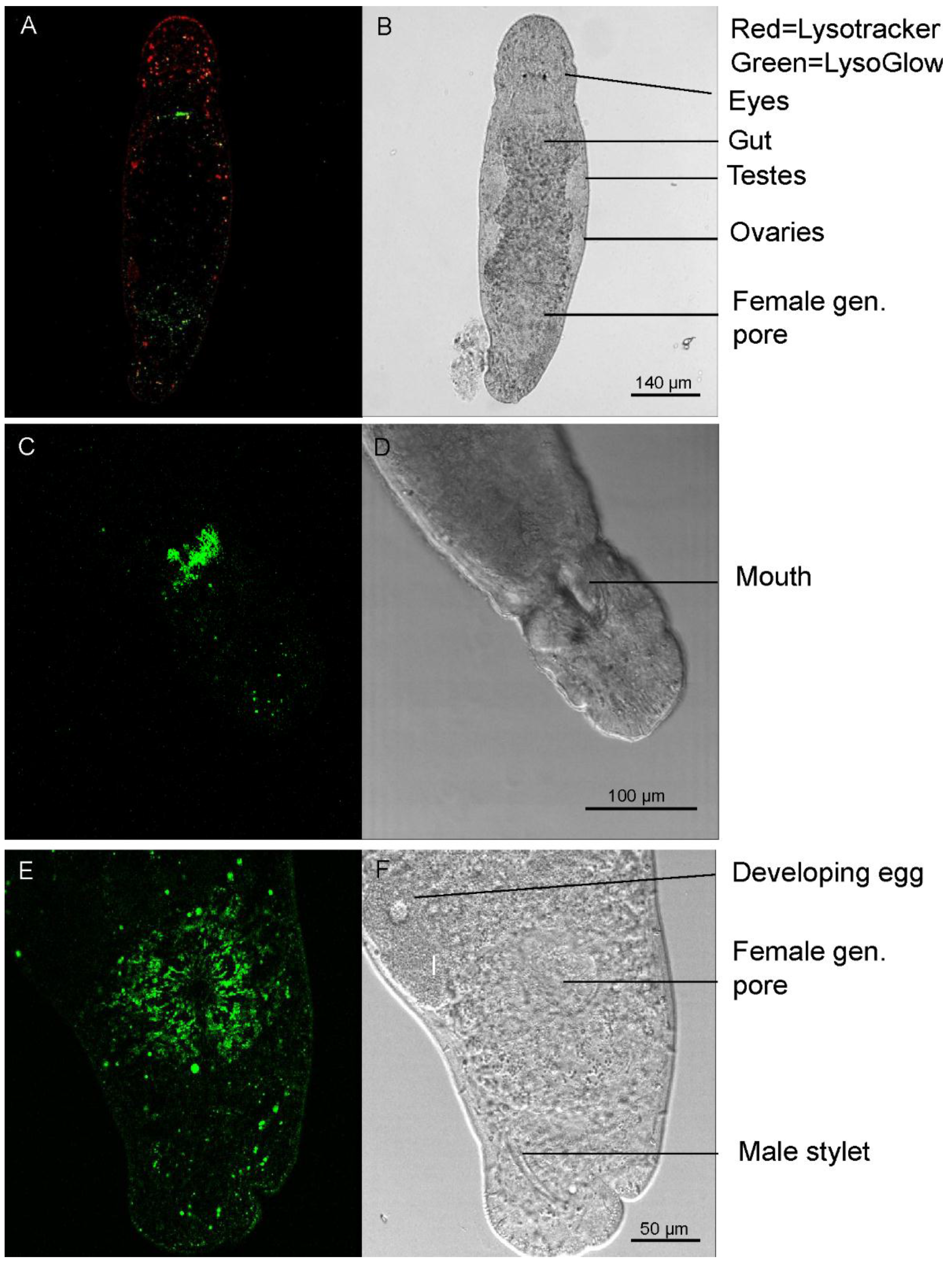 The culture of Macrostomum lignano was originally received from Dita Vizoso and Lucas Schärer (Basel) and was raised and maintained in 16/8 LD cycle in Petri dishes together with the diatom Nitzschia sp. at 20 ± 2 °C in our lab since 2011. Worms were incubated in F/2 medium for 1 h with 20 µM LysoGlow84 and/or 60–100 nM LysoTracker Red, washed with medium, and anesthetized with 7.18% MgCl2.