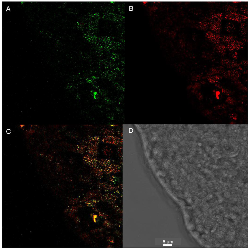 A: LysoGlow84 staining of epidermal cell layer of living and intact individual of Macrostomum lignano (green). B: LysoTracker Red staining (red). C: Overlay of the images shown in panels A and B. D: Transmission image of shown images. The scale bar in D represents 6 µm and applies to all images.