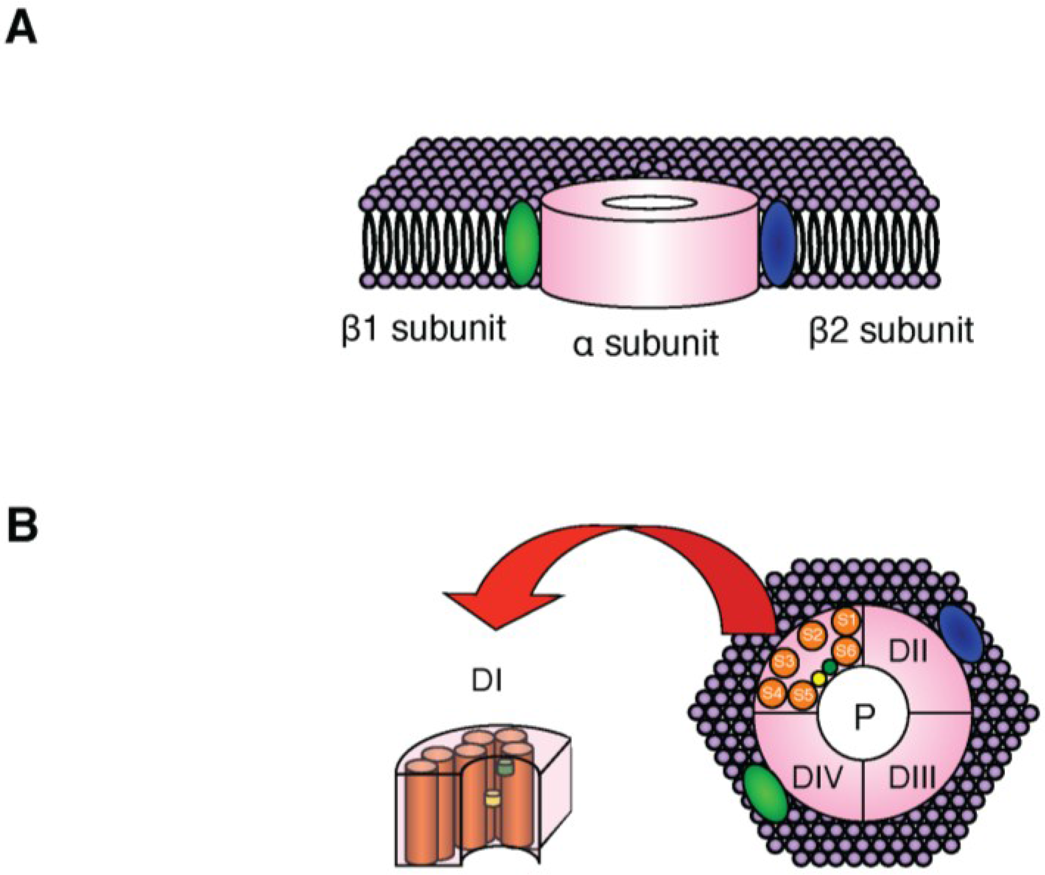 Molecular structure of NaV channels. (A) Schematic illustration of the predicted topology of NaV channels (α subunit and β subunits). The transmembrane domain model proposed by Catterall (2000) is shown [18]; (B) The α subunit is formed by four homologous domains (DI–DIV). Each domain consists of six α-helical transmembrane segments (S1–S6). P: channel pore.