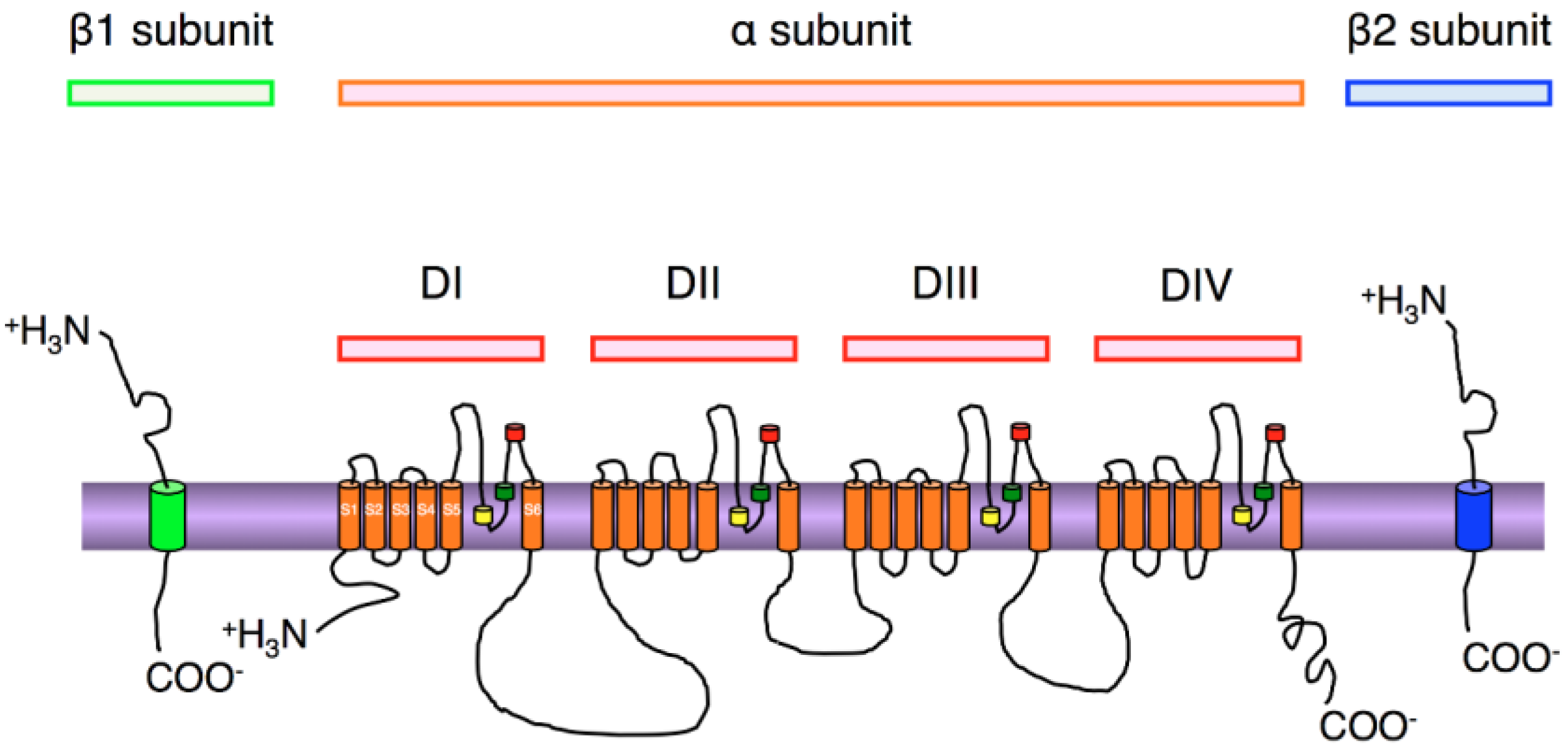 Schematic representations of the α and β subunit s of NaV channels. The α subunit is formed by four homologous domains (DI–IV). Each domain consists of six α-helical transmembrane segments (S1–S6). P loops are located between segment 5 and 6, which are the pore-lining regions (yellow and green). TTX binding sites are shown in red. The β subunits consist of an N-terminal containing an immunoglobulin-like loop and the splice site, a C-terminal, and a membrane-spanning segment.