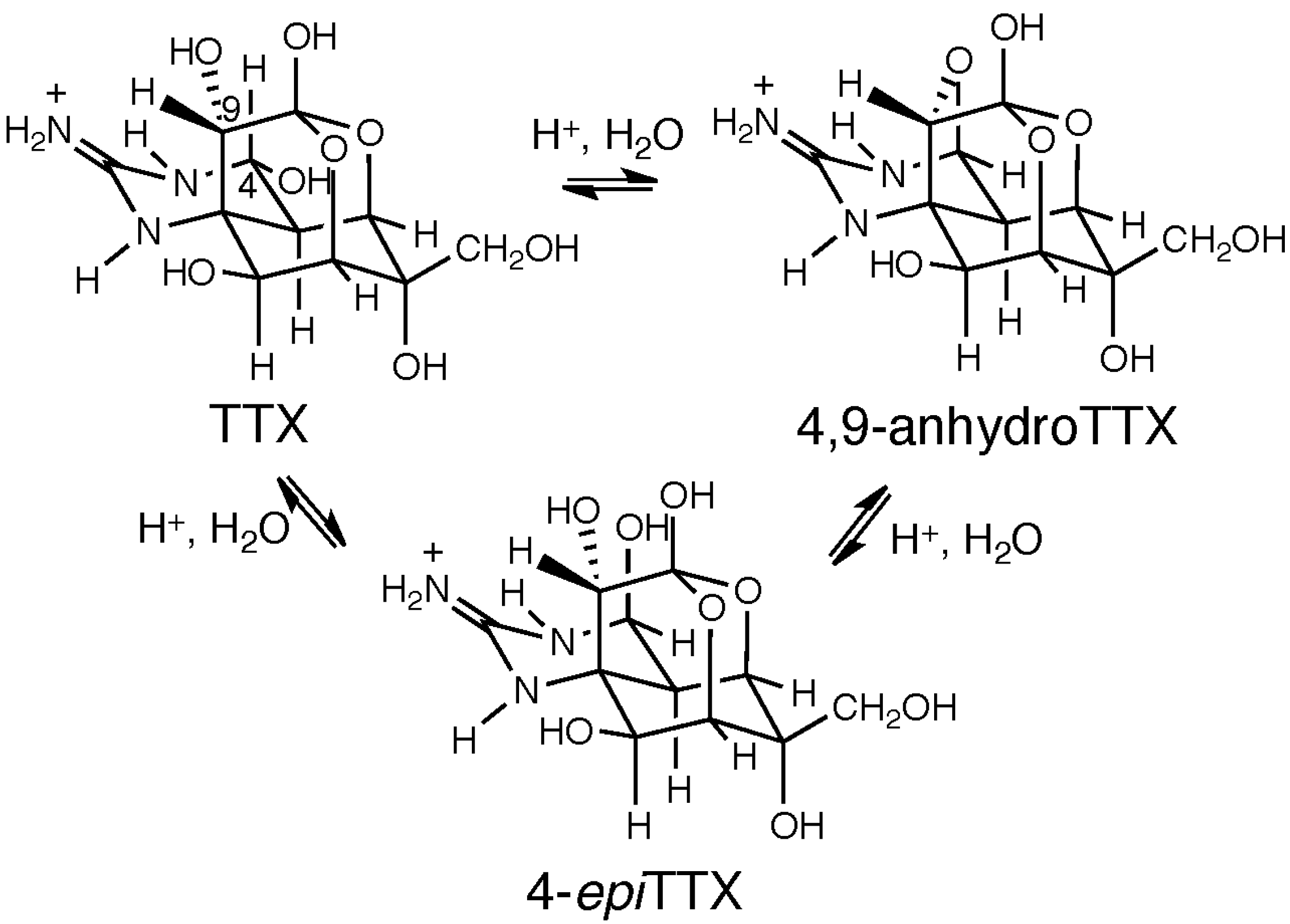 The interconversion of TTX, 4-epiTTX and 4,9-anhydroTTX resulting from the chemical equilibrium.