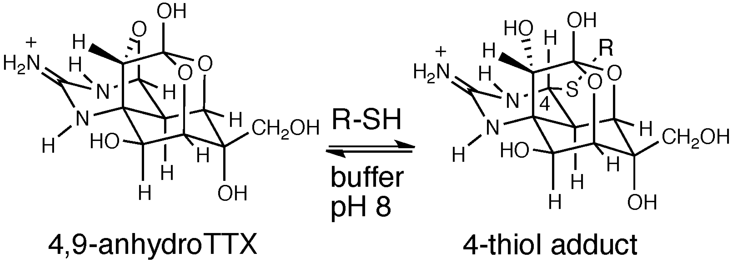 It has been reported previously that 4,9-anhydroTTX can react with a large excess of thiol compounds, such as cysteine, reduced glutathione (GSH) and mercaptoethanol (Figure 4; [54]). The hemiaminal ether carbon C-4 present in 4,9-anhydroTTX can easily accept nucleophiles. In fact, the cysteine adduct of TTX, 4-S-cysteinylTTX, has been isolated from the liver of the pufferfish, Takifugu pardalis, as a probable metabolite of TTX. This finding suggests that there is an abundance of 4,9-anhydroTTX and cysteine in the pufferfish liver. Indeed, the ratio of 4,9-anhydroTTX to total TTX analogues in the liver of the pufferfish is significantly larger than that in the ovary, although the reason for this specific distribution of 4,9-anhydroTTX in the liver remains unknown. The nucleophilic addition of thiols to the C-4 in 4,9-anhhydroTTX proceeds easily under slightly alkaline conditions (pH 8.0) depending on the pKa of the thiol groups (pKa of cysteine, 8.3–8.5). However, TTX barely reacts with thiol compounds, probably because the hemiaminal carbon (C-4) in TTX is less reactive than that in 4,9-anhydroTTX; a 4,9-ether would likely be a better leaving group than a 4-hydroxy group. In addition, the thiol adducts of TTX, 4-S-cysteinylTTX and 4-S-glutathionylTTX (4-GSTTX), are not stable under near-physiological conditions, with hydrolysis to 4,9-anhydroTTX in the presence of thiol compounds occurring readily in 0.8 M sodium phosphate buffer at pH 8 and 25 °C. Therefore, detoxification of TTX with thiols may not prove to be successful, even though 4-S-cysteinylTTX is almost non-toxic to mice.