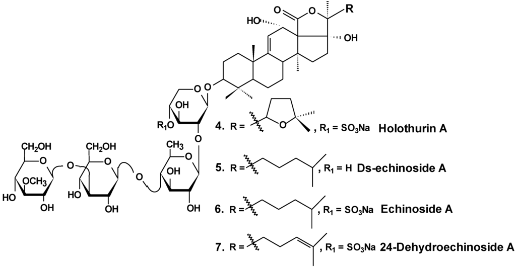 Structures of holothurin A and echinosides.